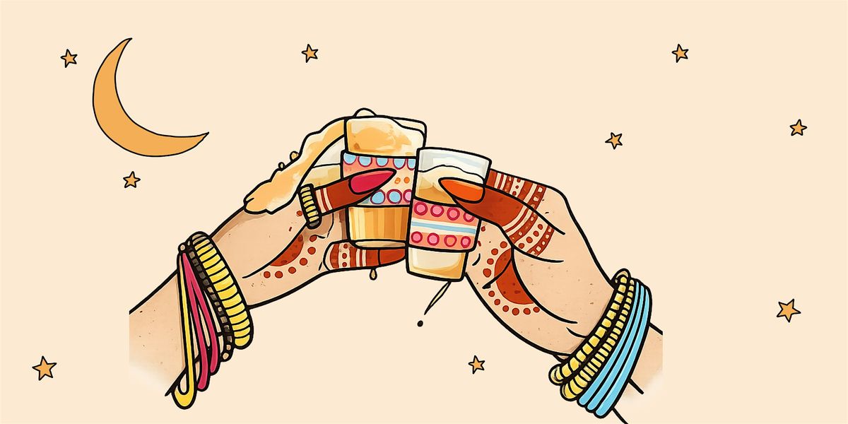 Around the space you’ll find a henna table, a craft table, and a relaxed corner for cards and conversation, alongside sweet and savory bites, cocktails, mocktails, and hot drinks flowing all evening. Music sets the tone while the room fills gradually and the night unfolds at its own pace.
