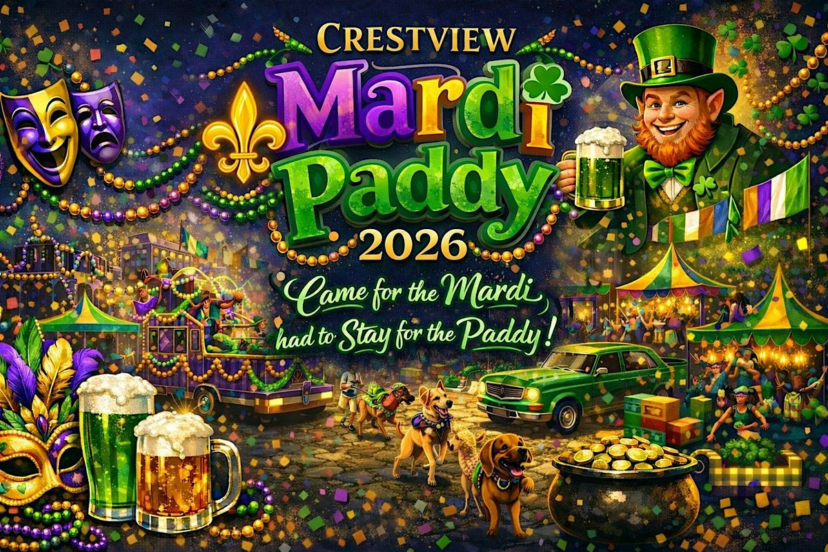 Get ready for Mardi Paddy, where Mardi Gras meets St. Patrickβs Day in the heart of Downtown Crestview! This two-day, family-friendly celebration blends New Orleans flair with Irish spirit β featuring food trucks, parades, pets, beads, music, and all the shamrock-shaking fun you can handle.
