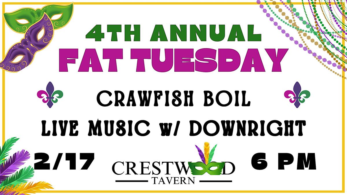 We're hosting our 4th Annual Fat Tuesday party with a crawfish boil and live music from the legendary band "Downright"!