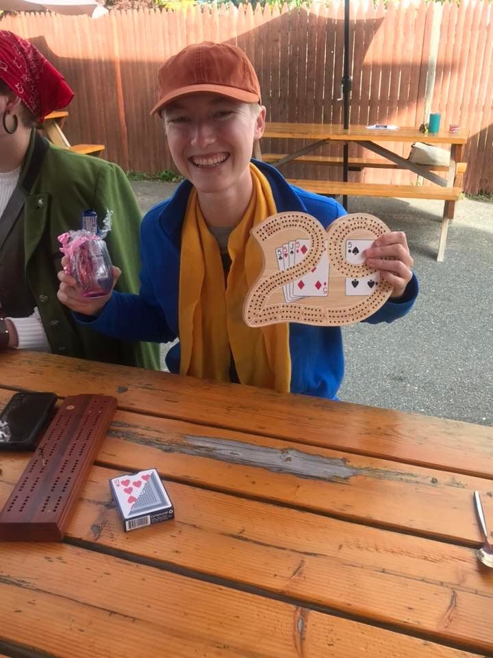 Second Annual Cribbage Tournament/Costume Contest. We're doing things a bit earlier this year, but we still want you to come on out and play. This year's costume theme is 80's movie characters. Choose your favorite character from a movie of that era, but don't tell us who it is. We'll see if we can guess. The entry fee for the event is $5 and all proceeds will go to our friends at Maine Needs as they did last year. We're all about making new friends so come prepared to laugh, joke and talk some smack. There will be a prize for the winner (and last place too). Play is three hours so we'll call it a wrap at 3:00 pm. The contest starts at noon sharp. We expect it will be quite a bit of fun.Pictured here is the current reigning champ. She's clearly a winner with that smile. Do you think you have what it takes to dethrone her?