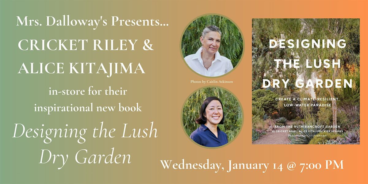 Join us at Mrs. Dalloway's Bookstore on Wednesday, January 14 when Cricket Riley and Alice Kitajima come to the store to present their new book Designing the Lush Dry Garden: Create a Climate-Resilient, Low-Water Paradise. Their presentation will include a slideshow and the authors will sign books afterward.
