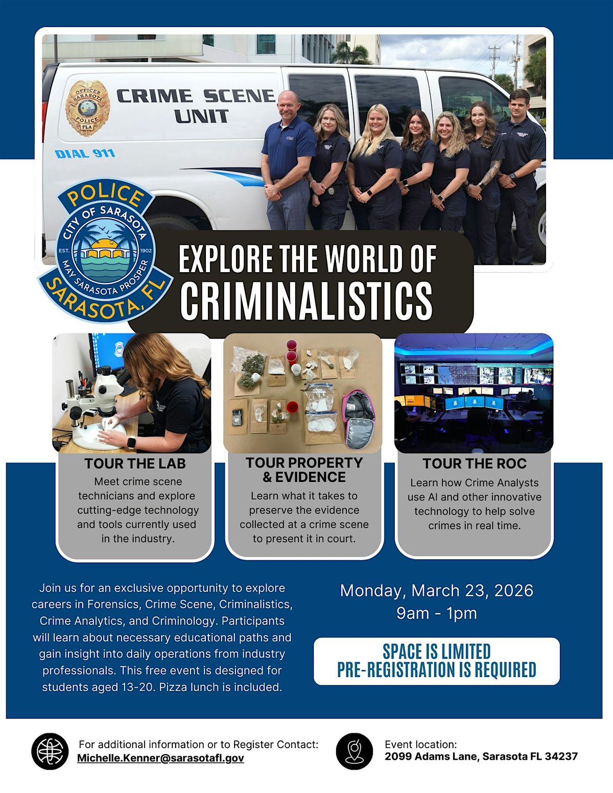 Join us for an exclusive opportunity to explore careers in Forensics, Crime Scene, Criminalistics, Crime Analytics, and Criminology. Participants will learn about the necessary educational paths and gain insight into daily operations from industry professionals. This free event is designed for students aged 13-20. A pizza lunch is included. Space is limited, participants MUST pre-register to attend.
