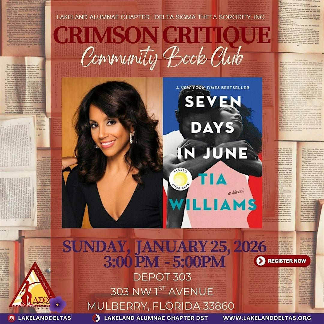 The Lakeland Alumnae Chapter of Delta Sigma Theta Sorority, Inc. welcomes and invites you to join us for our thurd Crimson Critique Community Book Club discussion on Seven Days in June by Tia Williams at Depot 303 on Sunday, January 25, 2026. Discussion begins at 3:00PM. The book discussion is free and open to the public.