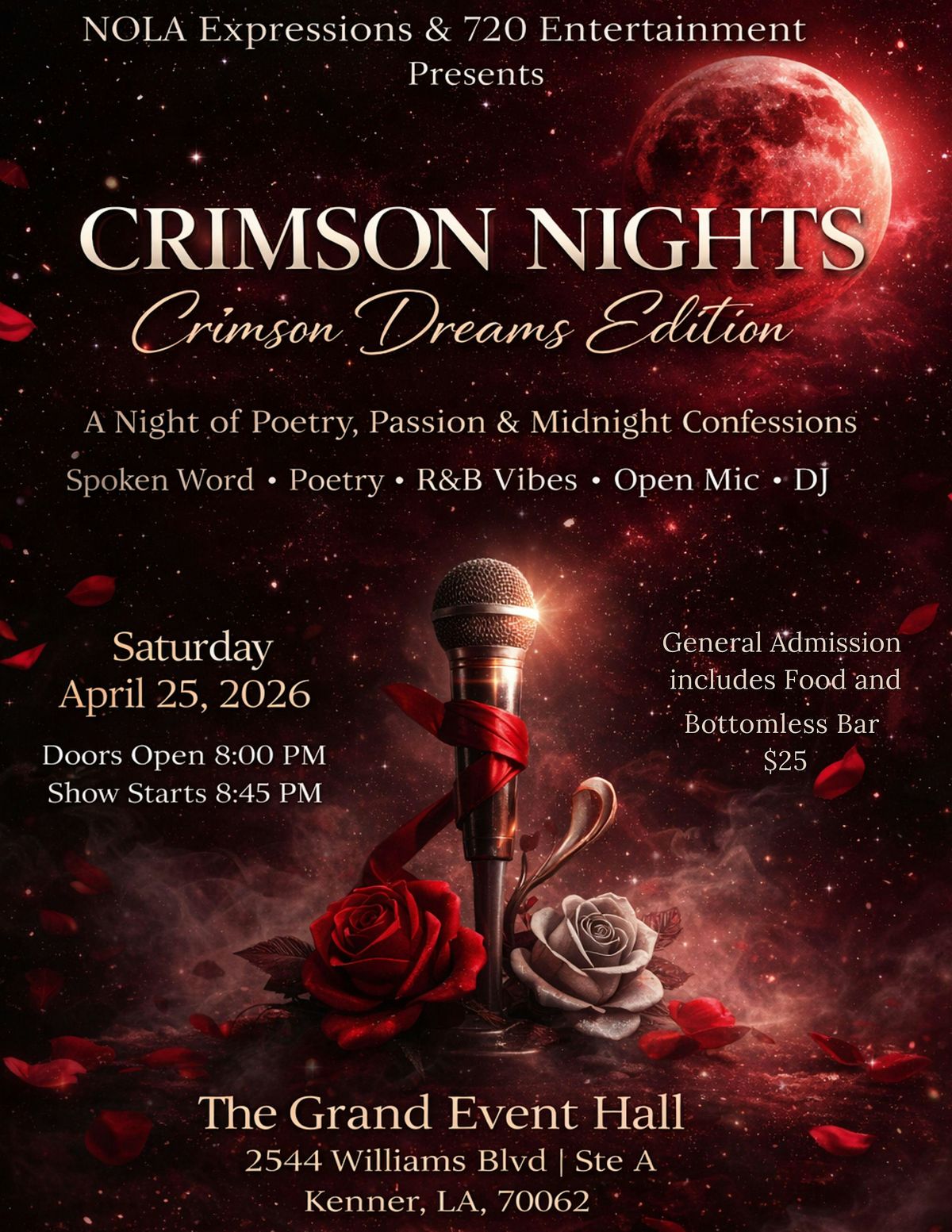 Step into an unforgettable night of spoken word, music, and raw expression at Crimson Nights: Crimson Dreams Edition.