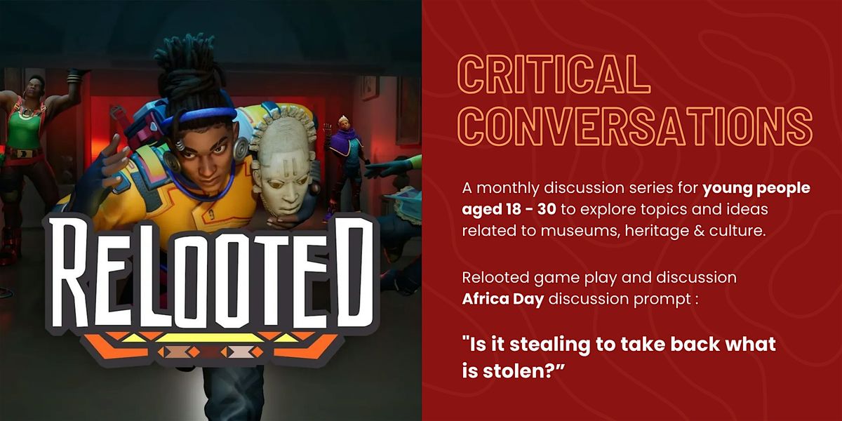The May edition of Critical Conversations will give space to play and discuss the computer game Relooted - "an Afrofuturist heist game with a twist: You’re not thieves, you’re liberators reclaiming stolen African artifacts from the dusty vaults of private collectors and Western museums."