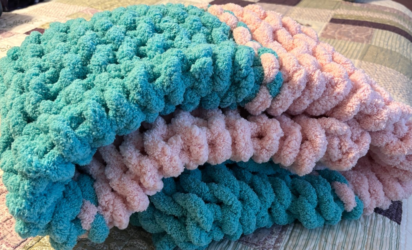 Hand knit a chunky throw blanket with soft, fluffy, extra thick chenille yarn. No experience needed. 6 colors to choose from, up to 3 different colors per person