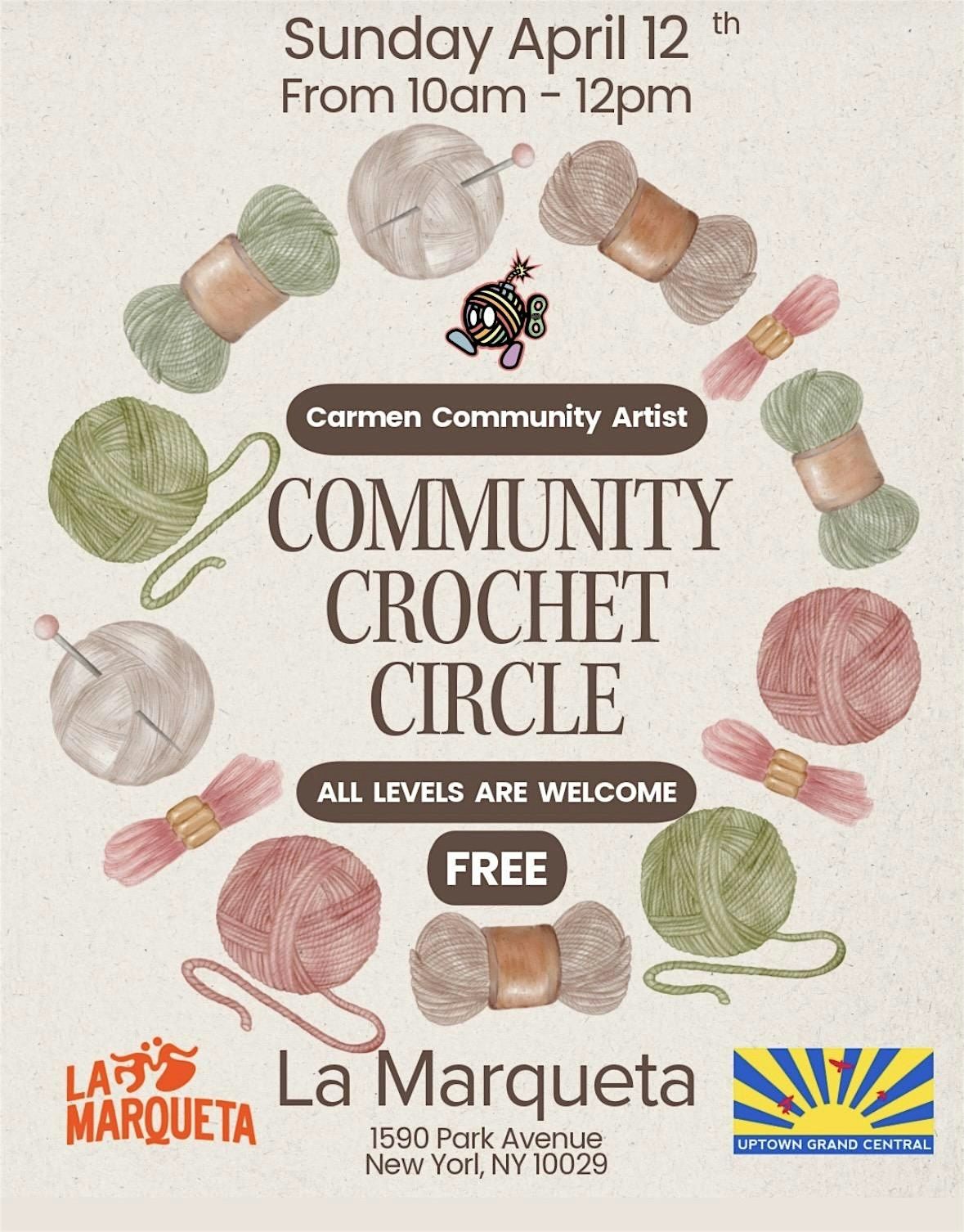 Carmen Community Artist will host a free Crochet Workshop on April 12, 2026, at La Marqueta (entrance on 115th Street & Park Avenue). All skill levels are welcome. Materials will be provided, and you’re encouraged to bring your own supplies or current projects to work on alongside a vibrant community of fellow crochet enthusiasts.