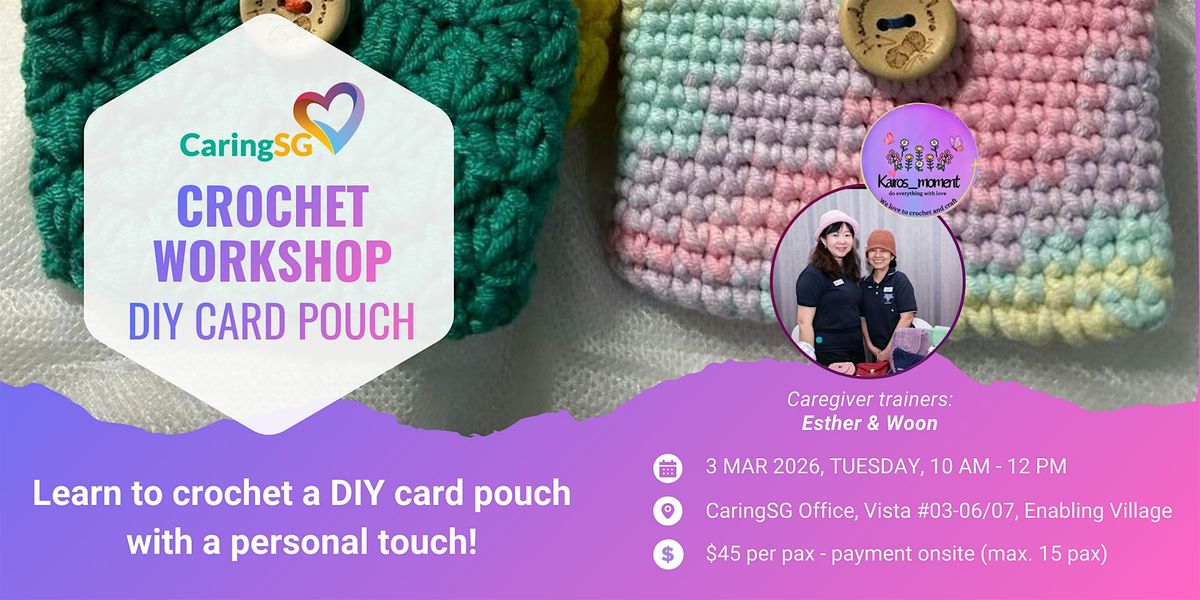 Guided step by step by caregiver trainers Esther and Woon from Kairos Moment, you’ll pick up basic crochet techniques and turn yarn into a practical pouch you can use every day.