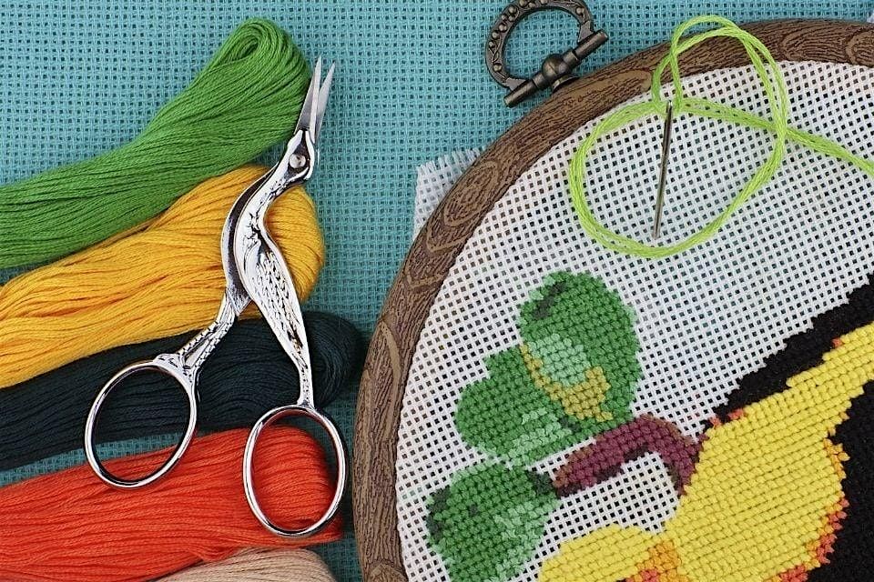 Overview of essential cross-stitch materials like hoops & frames, needles, fabric types, and threads. We will also go over the different types of cross stitch patterns and kits that are available!