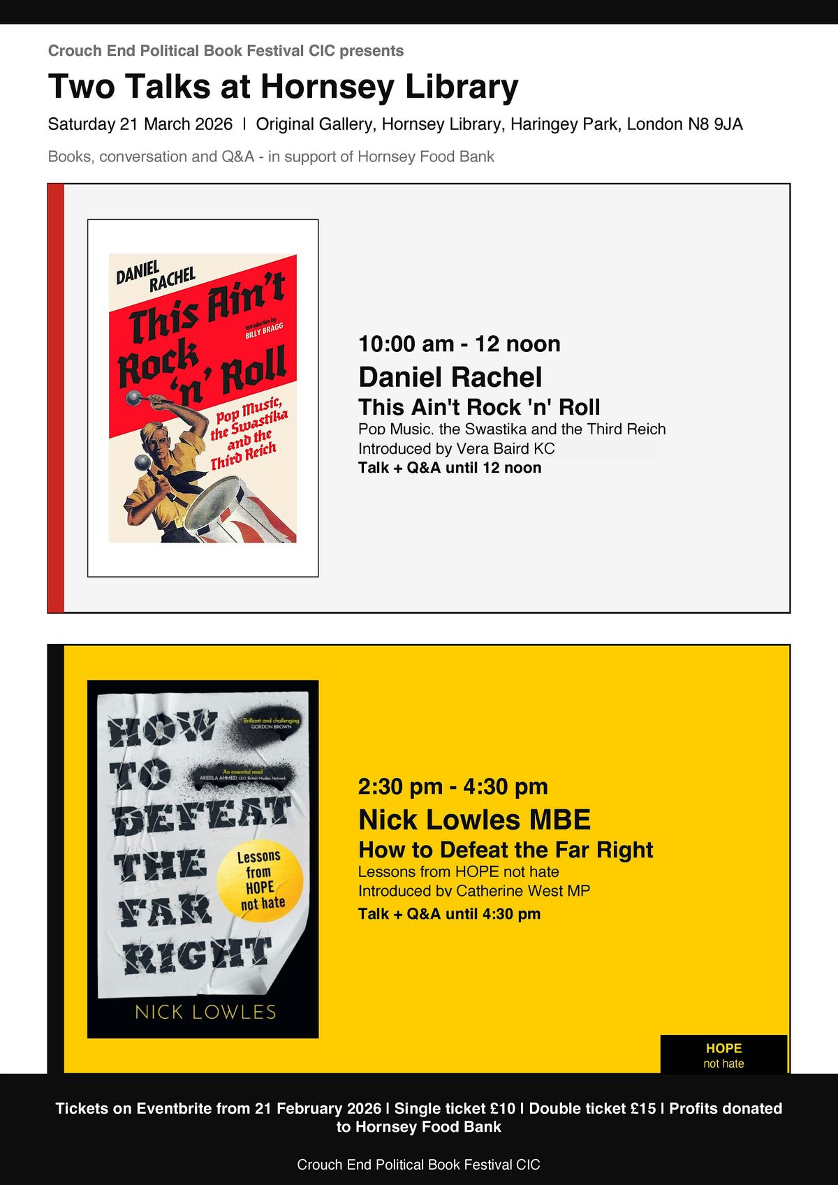 As there's a long time for lunch, we suggest that you browse the Hope Not Hate and Haringey Together Against Racism stalls. The later are organising a demo/march on 28th March 2026. Feel free to visit Crouch End but please retain your ticket.