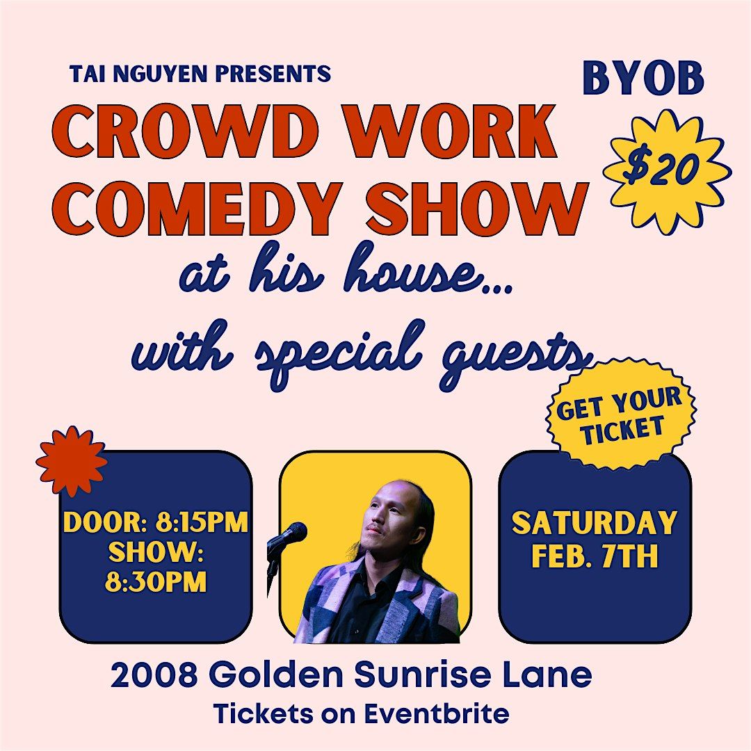 Join us in person for a night full of laughs where the comedians feed off your energy! This isn't your usual stand-up—expect jokes made on the spot, hilarious interactions, and a cozy house vibe. Come hang out, bring your friends, and be part of the fun crowd work experience. It's comedy, but way more personal and way more fun!