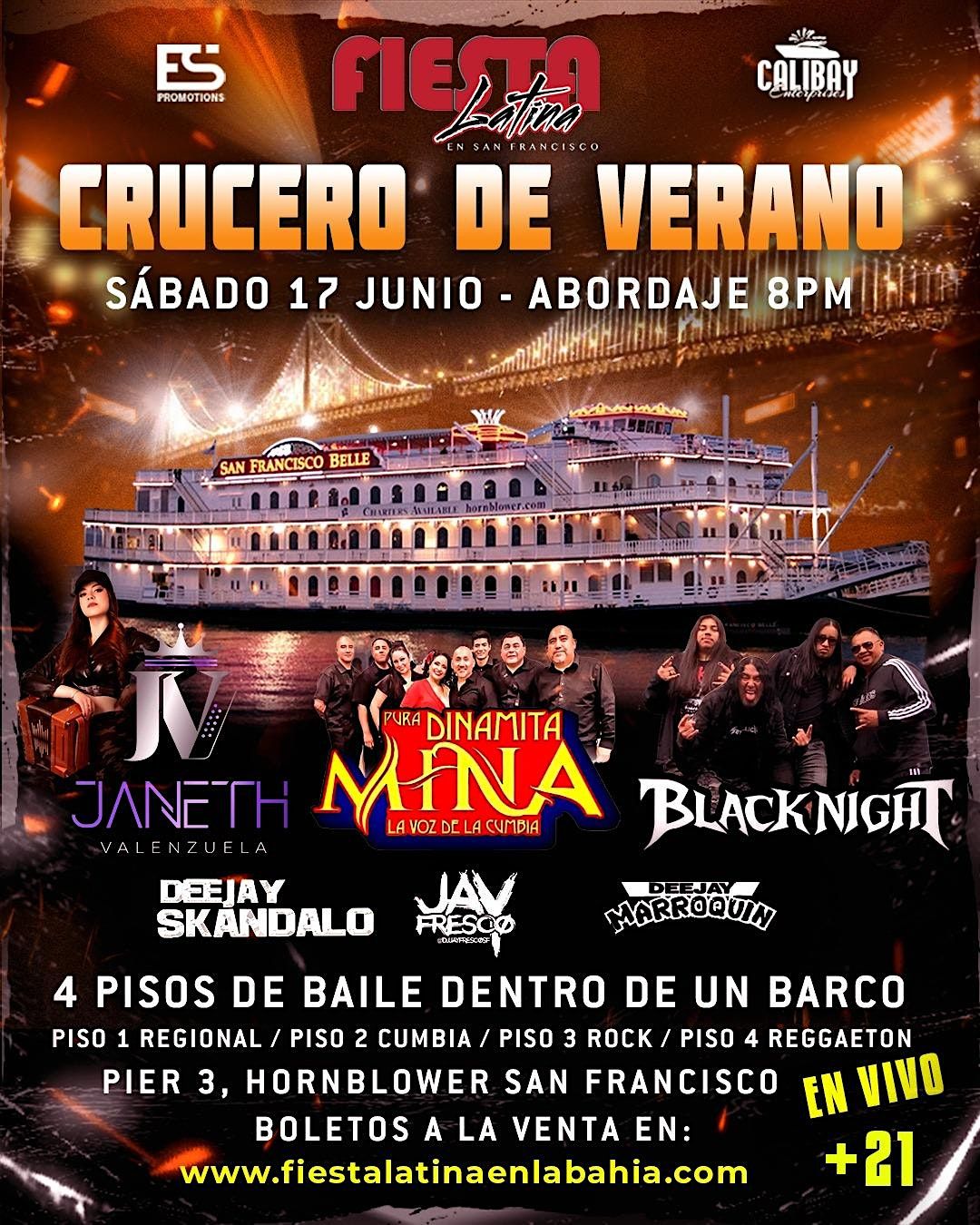 Las exclusivas fiestas en la bahía regresan este próximo Sábado 17 de Junio, en uno de los yates más grandes y lujosos de California "San Francisco Bell" con tu boleto tienes acceso a los 4 pisos de baile, diviértete navegando y bailando en la hermosa bahía de San Francisco por 3 horas.
