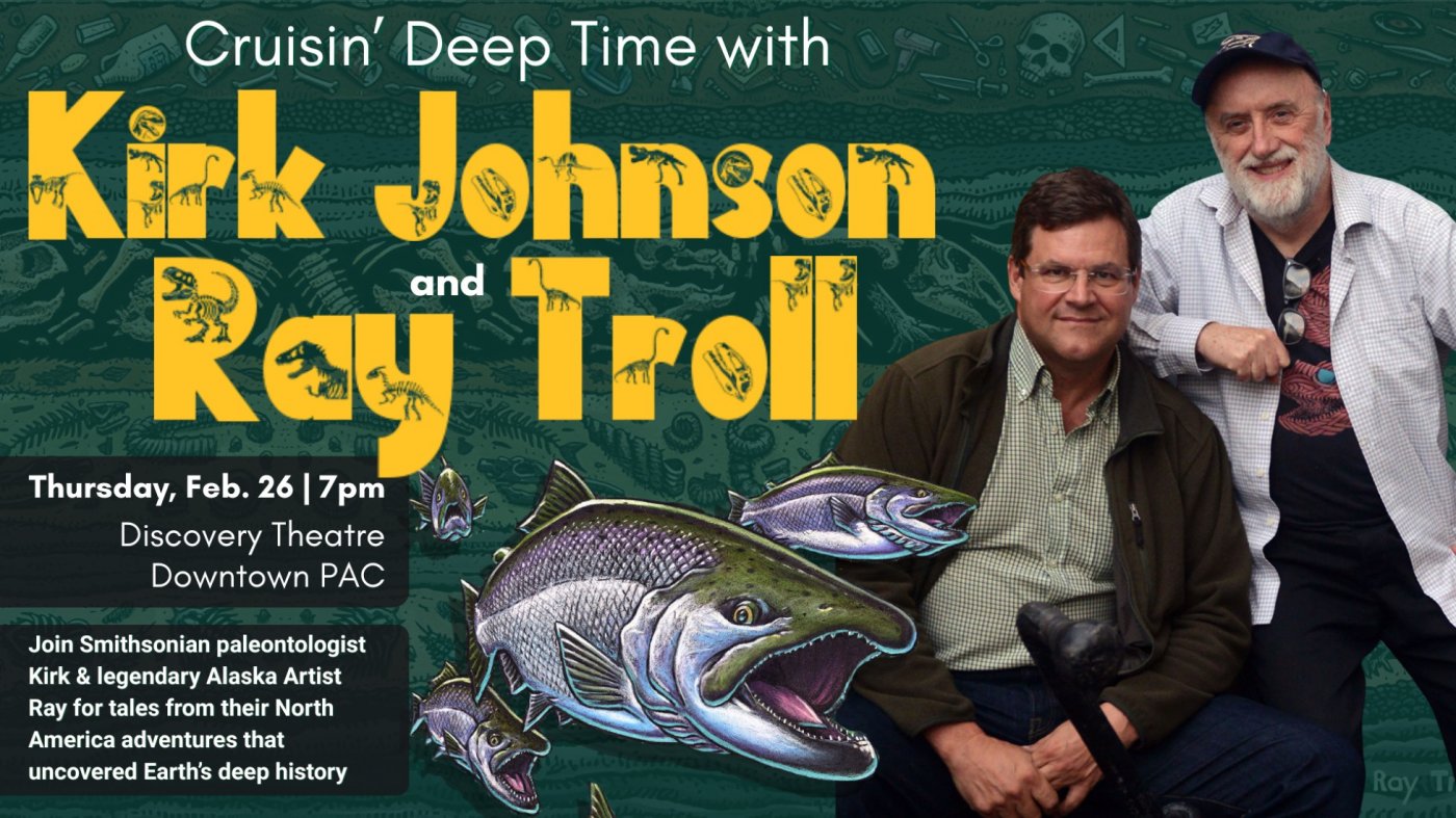 Join Smithsonian paleontologist Kirk Johnson and legendary Alaska artist Ray Troll for tales from their North American adventures uncovering Earth’s deep history. By blending their interests in science and art, this event brings together new stories and visuals that may be familiar to many Alaskans.