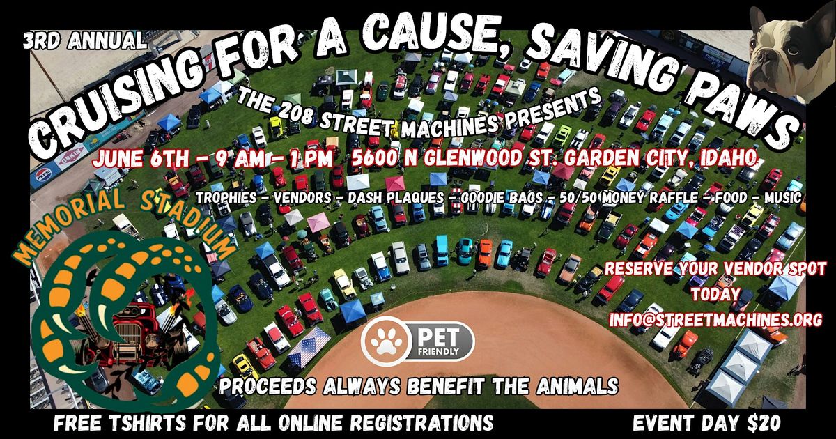 Welcome to Cruising for a Cause, Saving Paws! Join us at 5600 N Glenwood St on June 6, 2026 at 9:00 AM for a day filled with street machines, fun and furry friends. 🐾 Let's come together to support our four-legged companions. Don't miss out on this paw-some opportunity to make a difference! See you there!