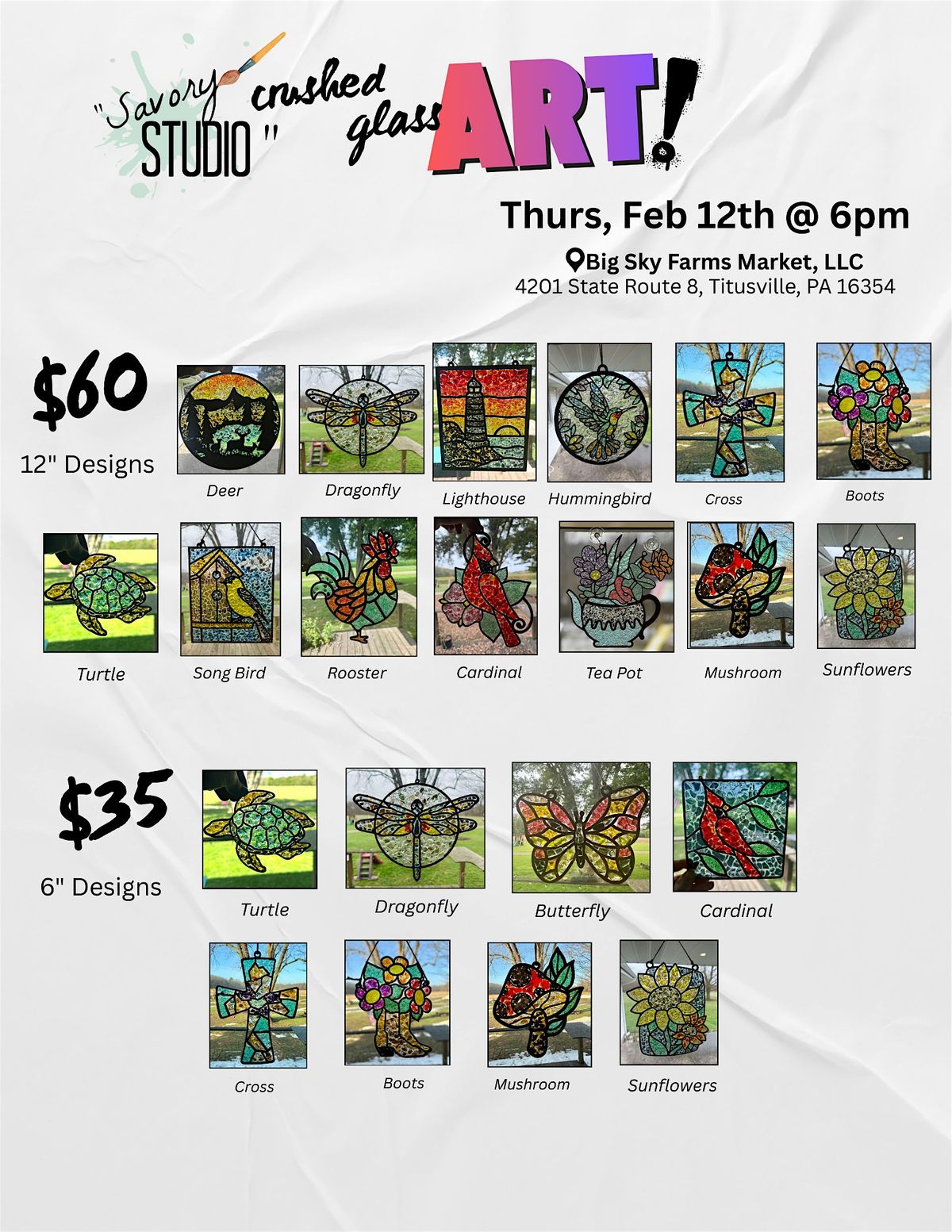 Join us at Big Sky Farms Market, LLC on **Thursday, February 12th* at **6pm** for a fun and creative experience. Learn how to create stunning art pieces using crushed glass and resin,