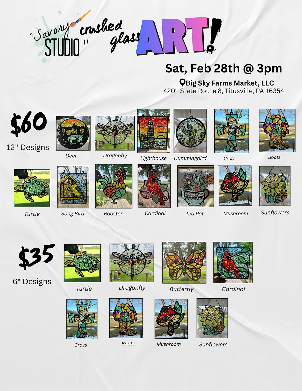 Join us at Big Sky Farms Market, LLC on **Saturday, February 28th* at **3pm** for a fun and creative experience. Learn how to create stunning art pieces using crushed glass and resin,