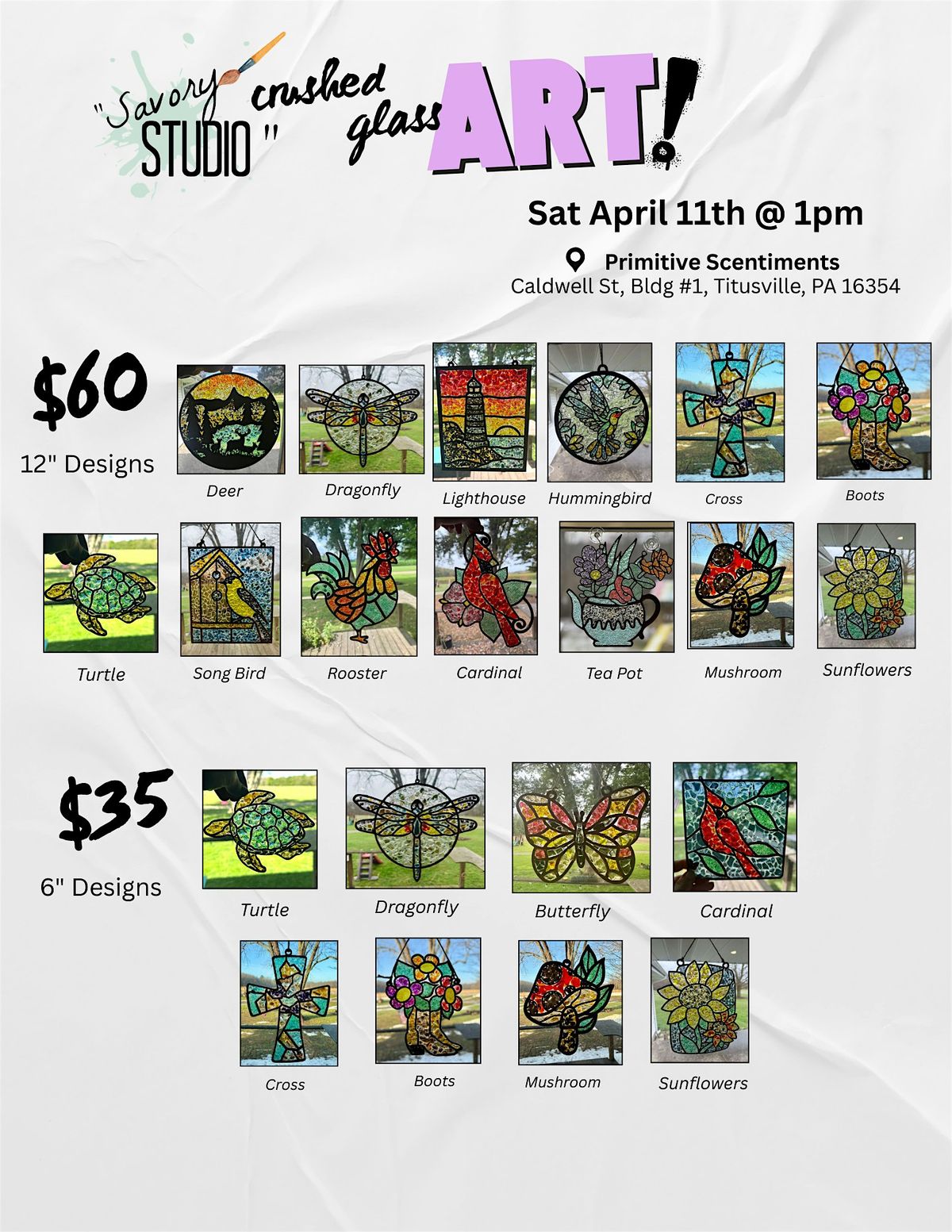 Join us at Primitive Scentiments on **Saturday, April 11th at 1pm** for a fun and creative experience. Learn how to create stunning art pieces using crushed glass and resin,