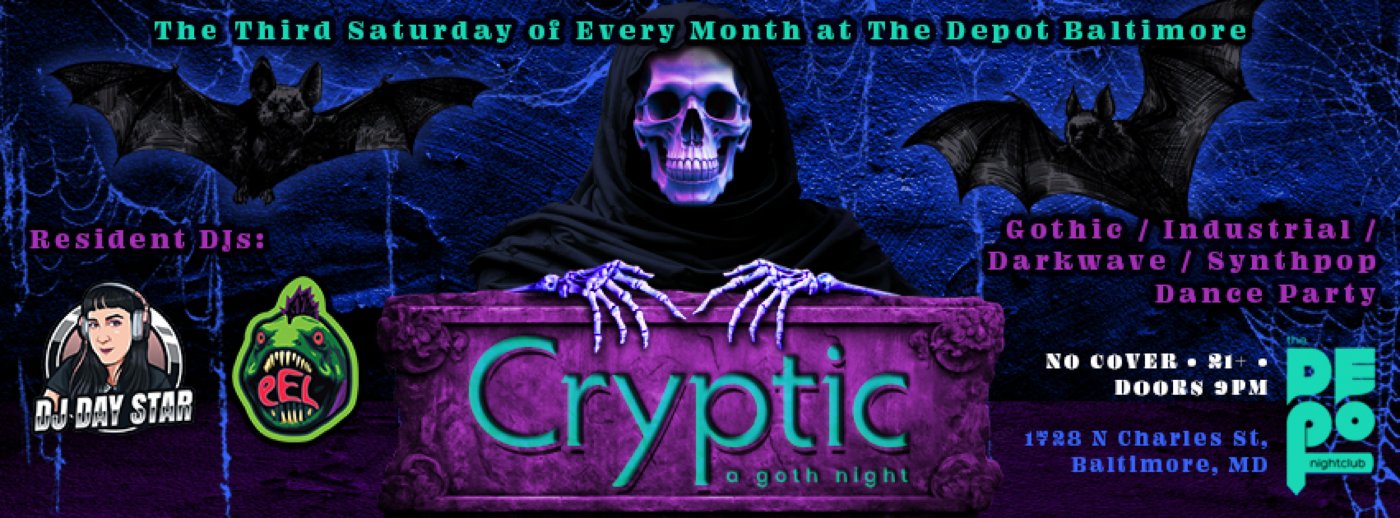 Join resident DJs Day Star and eEL on the 3RD SATURDAY OF EACH MONTH for a Goth + Industrial + Darkwave club night at The Depot Baltimore. Possible art/craft vendors & guest DJs will be announced monthly. Follow the Cryptic Facebook page: https://www.facebook.com/CrypticGothic