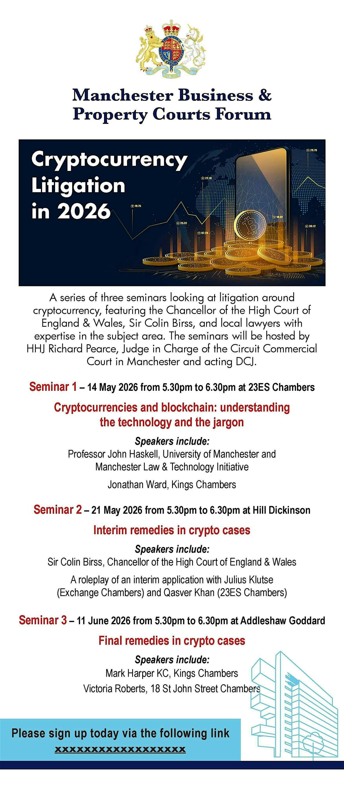 A series of three seminars looking at litigation around cryptocurrency, featuring the Chancellor of the High Court of England & Wales, Sir Colin Birss, and local lawyers with expertise in the subject area. The seminars will be hosted by HHJ Richard Pearce, Judge in Charge of the Circuit Commercial Court in Manchester and acting DCJ.