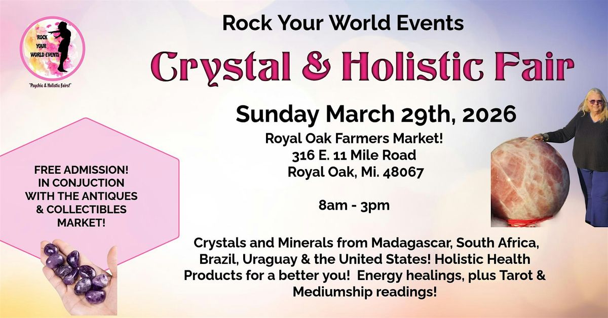 Join us for a large display of crystals, minerals, fossils, jewelry and more! This holistic market is all about the body, mind and spirit! Experience reiki healings, get a tarot or mediumship reading, learn about products for a healther you! Join us for this special day at the Royal Oak Antique & Collectible Market! Free Admission! Visit the Rock Your World Crystal Booth for a free gift! Pre-register here for your free gift! It is all about the Body, Mind & Spirit!