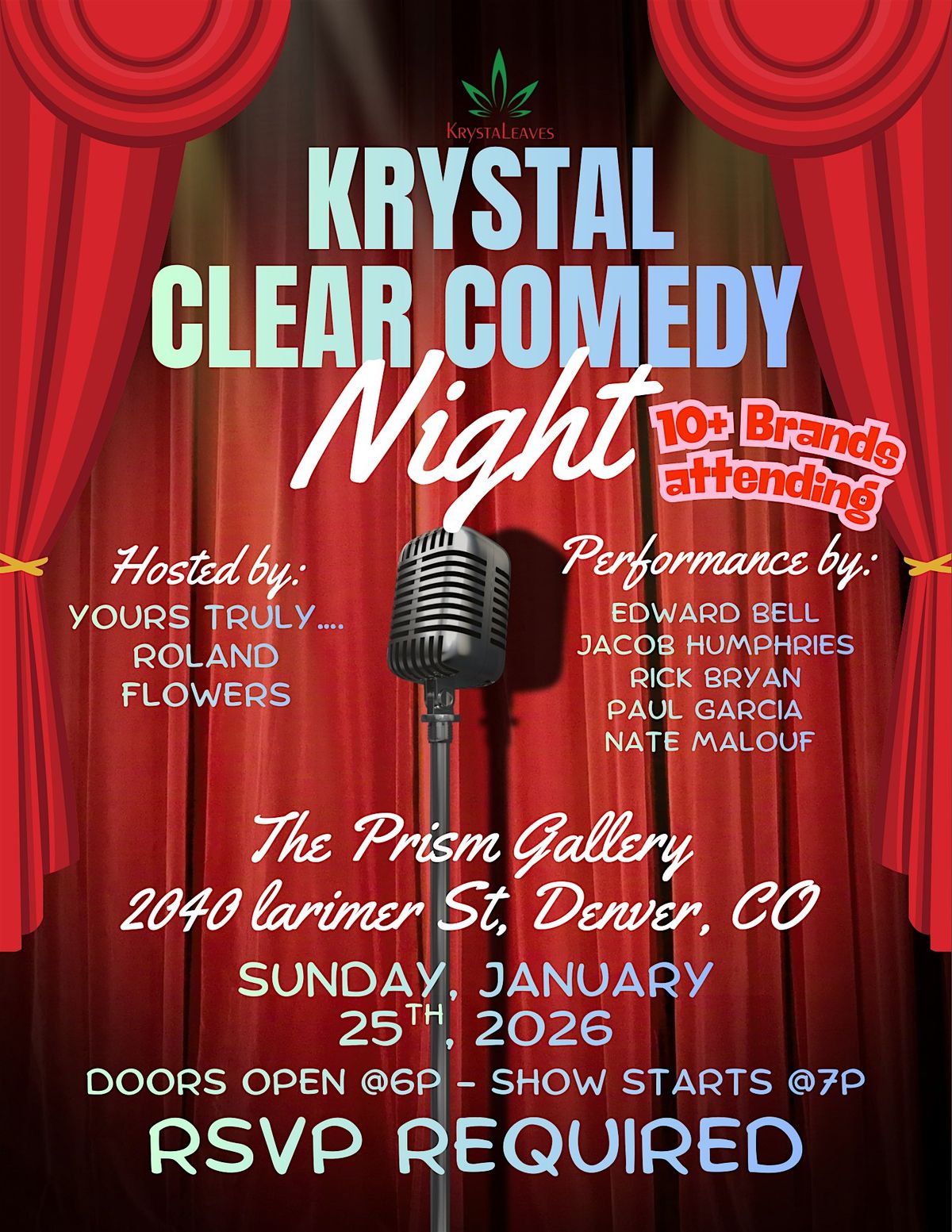 Get ready for a night full of hilarious laughs and good vibes at Crystal Clear Comedy! Join us in person for an unforgettable comedy show that'll have you rolling with laughter. Perfect way to chill, enjoy some top-notch humor, and meet fellow comedy lovers. Don’t miss out on the fun – it’s gonna be a blast!