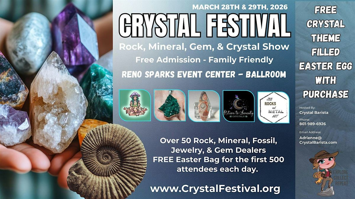 The Crystal Festival is back in Reno! First 500 groups through each day will get a reusable bag and collect Crystal Theme Filled Easter Eggs with purchase from select vendors! This is Reno's favorite FREE Rock, Mineral, Gem, and Crystal show!Over 50 Vendors!