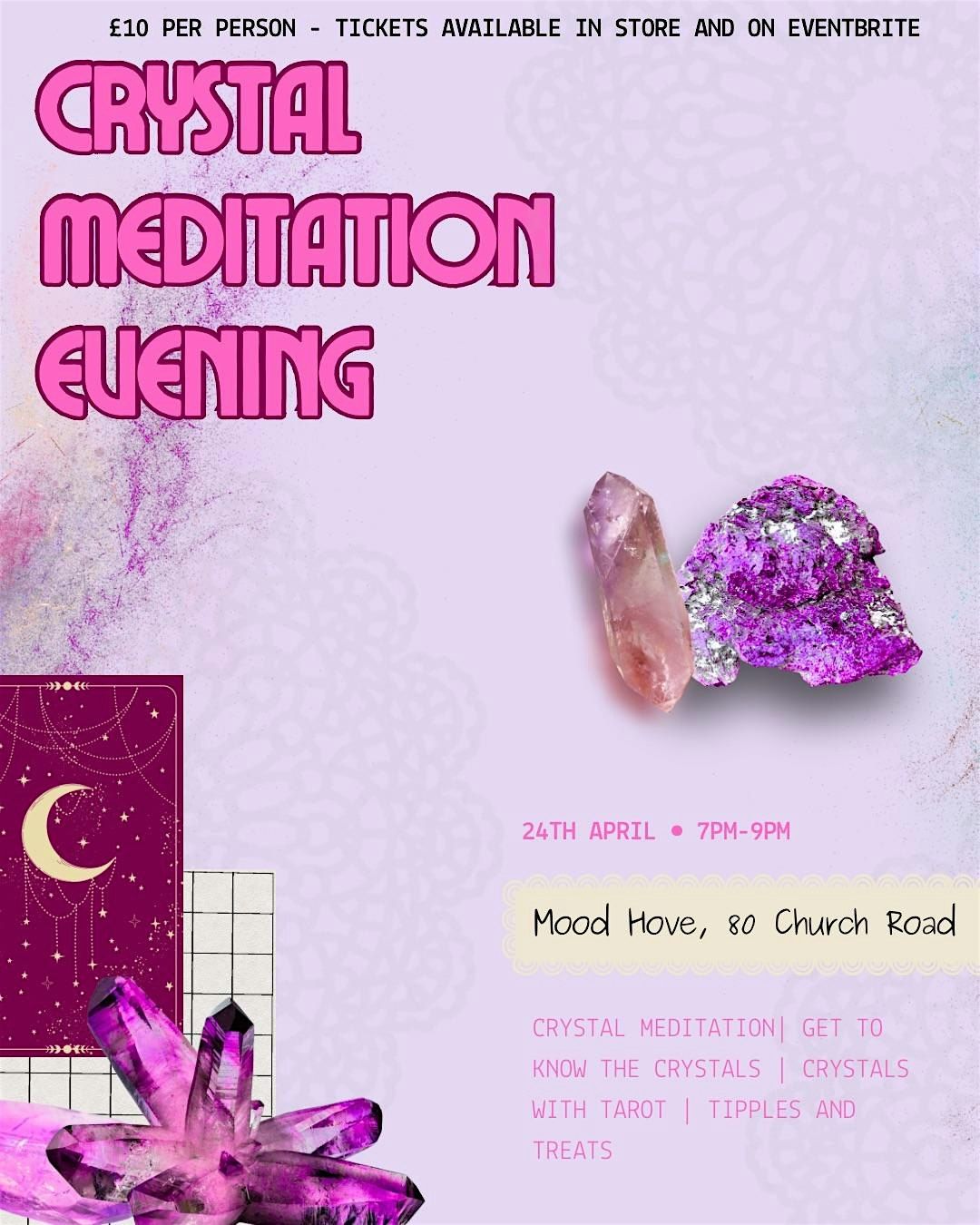 Join us for a relaxing and refreshing evening at Mood Hove! On May 24, 2026 at 7:00 PM (BST), we'll dive into the calming world of crystal meditation together. Whether you're new or experienced, come unwind, connect, and recharge your energy in a chill, friendly atmosphere. Bring your good vibes and get ready for a peaceful night!