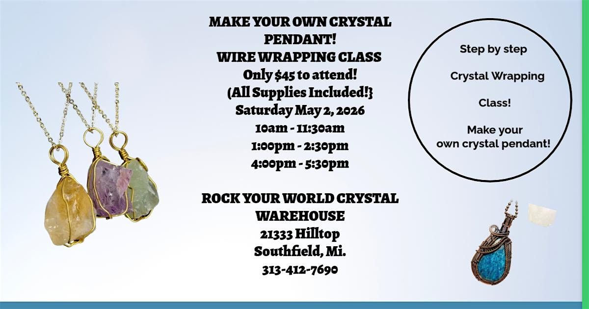 Learn how to make your own wire wrapped crystal pendant in 5 easy steps! All supplies included! Choose your own crystal or bring your own! Time to shop the crystal warehouse before or after your class! Rock Your World Crystal warehouse houses stones, crystals and minerals from around the world! Class taught by Brianna Curry from the former Rock Your World Crystal Store in Livonia.