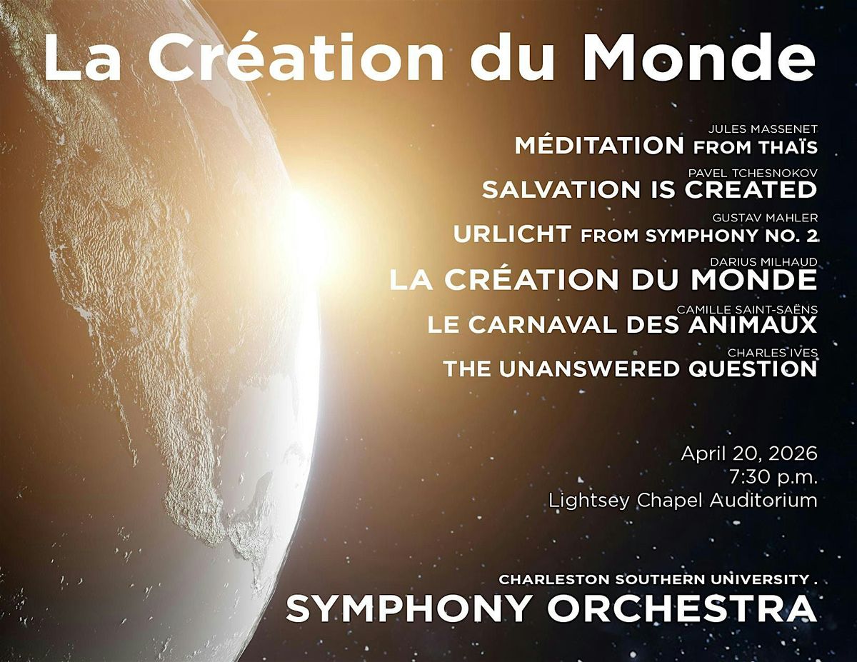 The CSU Symphony Orchestra recounts creation with the music of Massanet, Tschnokov, Mahler, Milhaud, Saint-Saëns, and Charles Ives.