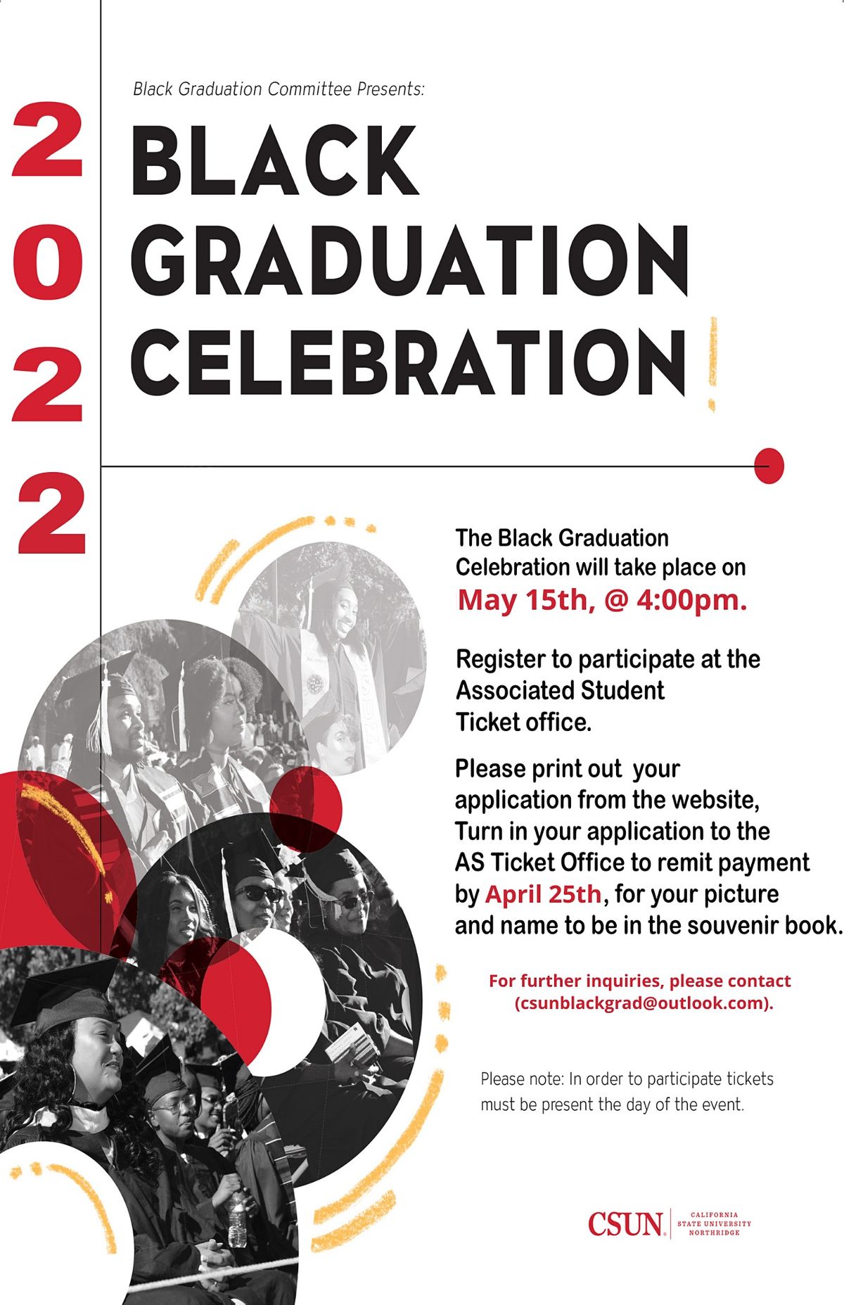 The Black Graduation Ceremony was introduced to California State University Northridge in 1972. This annual event gives African-American parents, students, faculty, and staff an opportunity to celebrate the success of our students. Most of our students participating in the ceremony are first generation college students who have persisted against the many obstacles confronting them in their journey toward their degrees. Black Graduation is a student ran organization that values the student voice when curating the ceremony for themselves and peers. This ceremony is funded primary by student fees, along with the generosity of Associate Students, Educational Opportunity Program (EOP) Central Office, The University Student Union, and various sponsorships from the community.