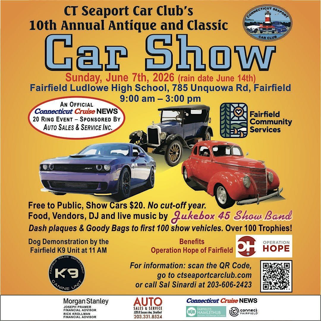 This event is a charity car show on Sunday, June 7, 2026, with a rain date of Sunday, June 14th, 2026. It’s the CT Seaport Car Club’s 10th Annual Antique and Classic Car Show. Car show parking is in the back parking lot of Fairfield Ludlowe High School (785 Unquowa Rd, Fairfield) - Many parking spots in the SHADE. There will be 100+ trophies/awards and it will be an Official Connecticut Cruise News 20 Ring Event, sponsored by Auto Sales & Service, Inc.