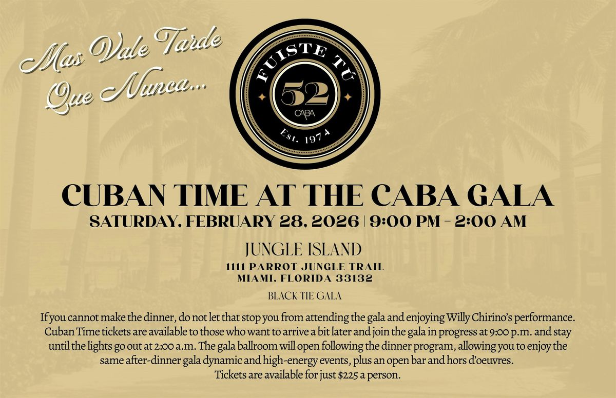 If you cannot make the dinner, do not let that stop you from attending the gala and enjoyingWillyChirino's performance. Cuban Time tickets are available to those who want to arrive a bit later and join the gala in progress at 9:00 p.m. and stay until the lights go out at 2:00 a.m. The gala ballroom will open following the dinner program, allowing you to enjoy the same after-dinner gala dynamic and highenergy events, plus an open bar and hors d'oeuvres.