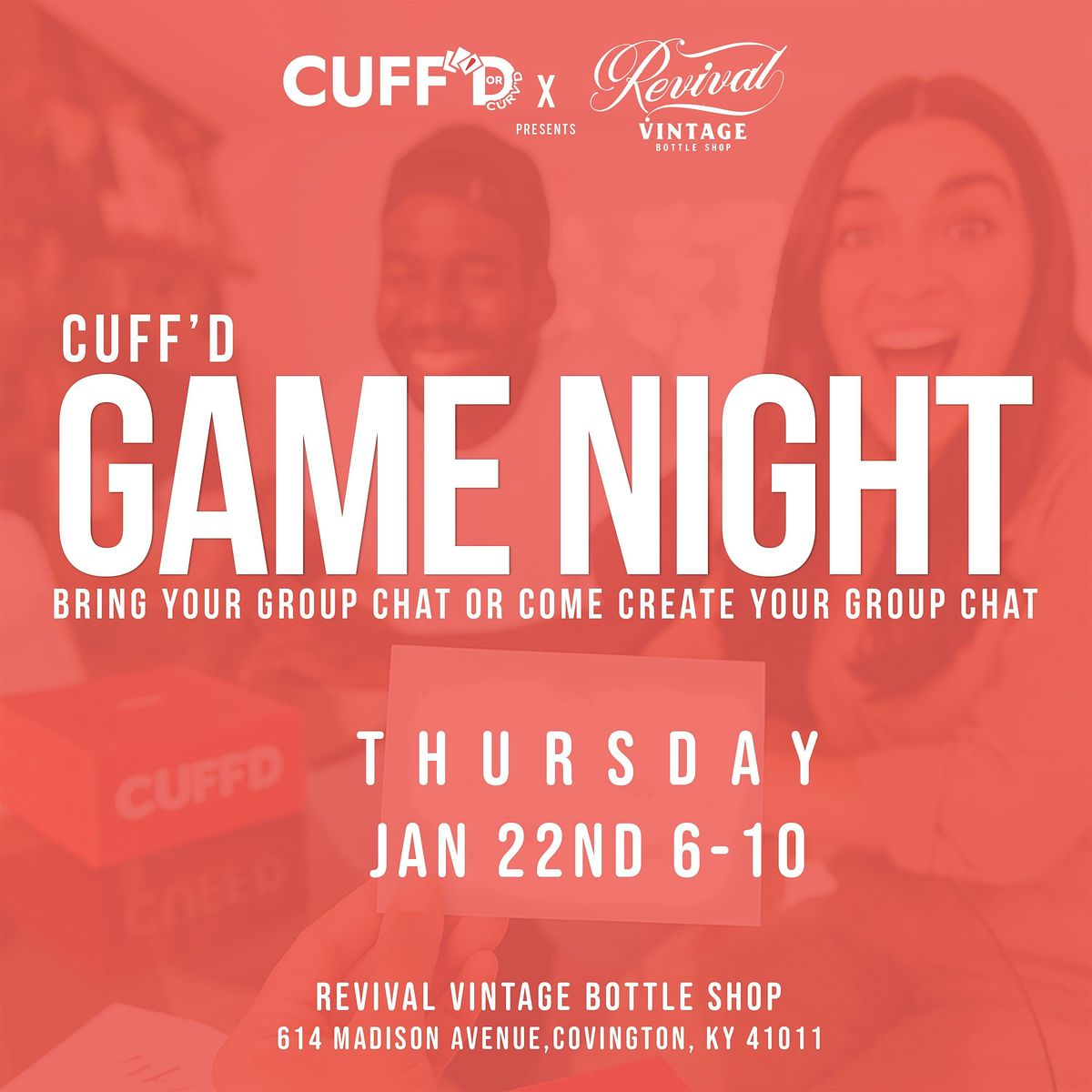 A high-vibe evening centered around Cuff’d Game Night Cards, interactive Cuff’d challenges, and Revival’s vintage spirits atmosphere. you'll rotate between Cuff'd Game night cards and Cuff’d interactive games, with Elle and Draco leading all gameplay and transitions.
