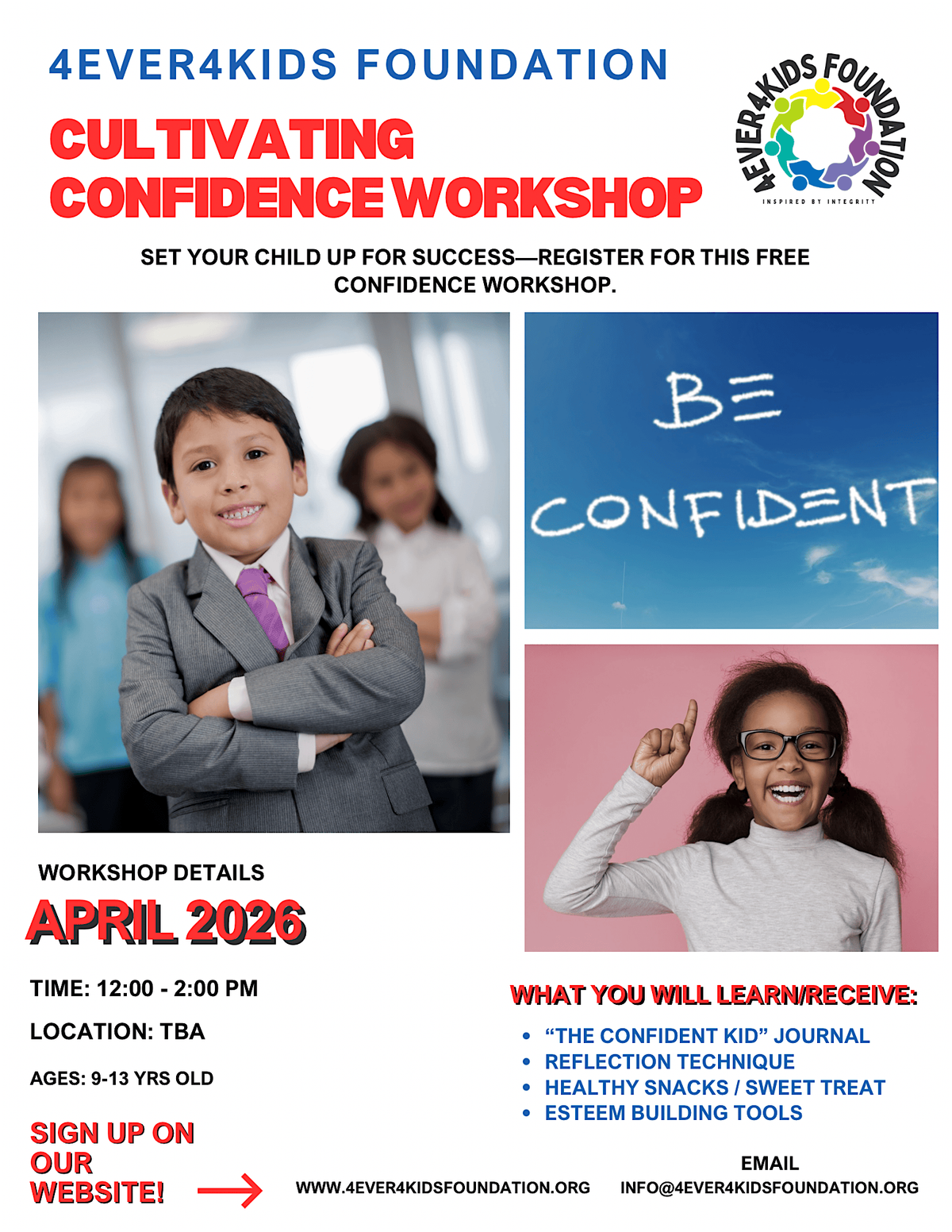 Brought to you by the 4ever4kids Foundation, this in-person event is all about boosting your self-esteem and embracing your true self. Come hang out, learn fun tips, and connect with others who want to grow their confidence too. Don't miss this awesome chance to shine brighter!