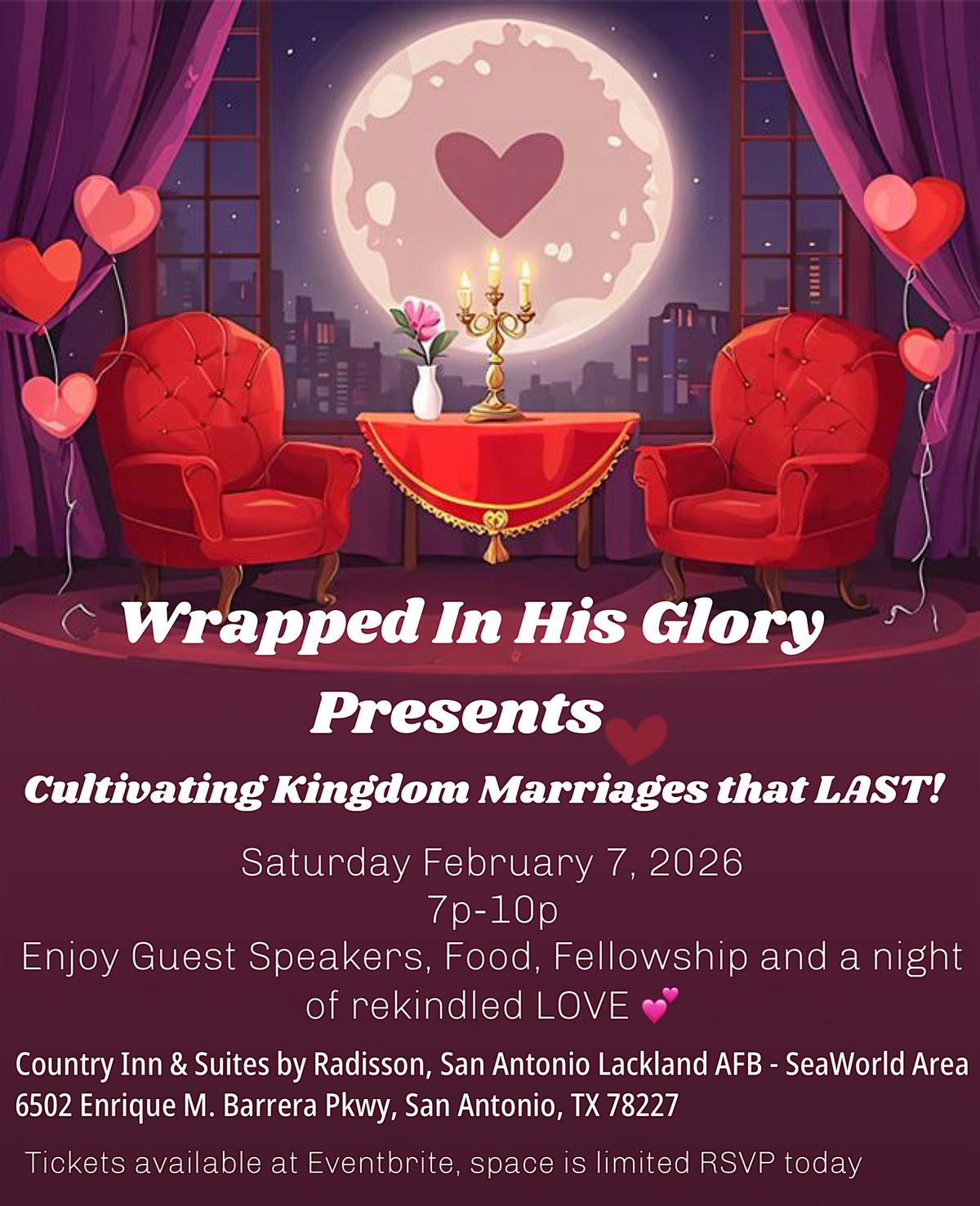 Invest in your MARRIAGE! Enjoy a romantic evening of faith based guidance on healthy successful marriages, food, games and Rekindled LOVE.