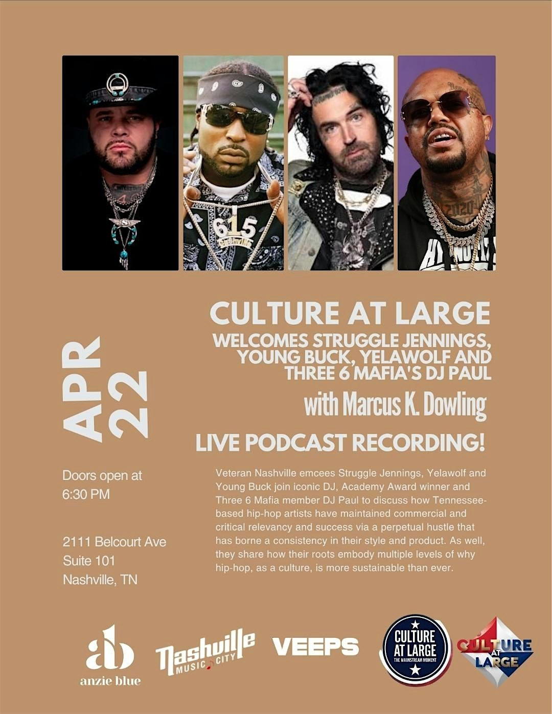 Veteran Nashville emcees Struggle Jennings, Yelawolf and Young Buck join iconic DJ, Academy Award winner and Three 6 Mafia member DJ Paul to discuss how Tennessee- based hip-hop artists have maintained commercial and critical relevancy and success via a perpetual hustle that has borne a consistency in their style and product. As well, they share how their roots embody multiple levels of why hip-hop, as a culture, is more sustainable than ever.