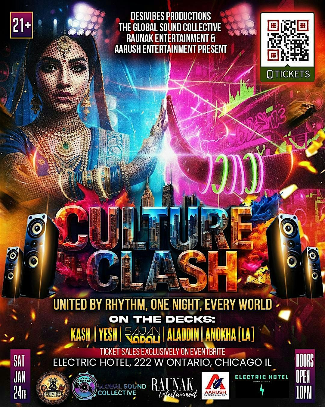 Desivibes Productions & The Global Sound Collective - two of the popular production houses in the nation, based out of LA, in collaboration with Raunak Entertainment, and Aarush Entertainment, are bringing together the rhythmic soul of the Indian subcontinent, the Middle East and the pulse of the global underground for one unforgettable night. And we are elevating the bar by parterning and collaborating with one of Chicago's top Tier1 venues - ELECTRIC HOTEL NIGHTCLUB!!!