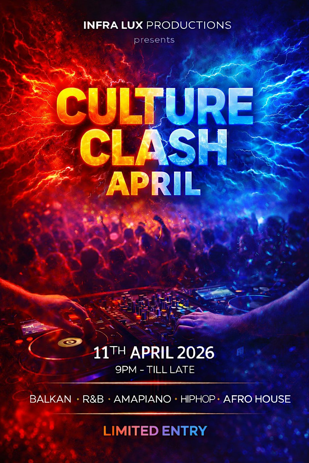 Culture Clash April by Infra Lux Productions is an electrifying apartment takeover bringing together the best of Balkan, R&B, Amapiano, Hip Hop and Afro House under one roof. On April 11th, expect high-energy DJ sets, immersive club lighting, and a crowd ready to move from 9PM till late. This is where sounds collide, cultures connect, and the vibe never drops. Limited entry. London. Be part of it.