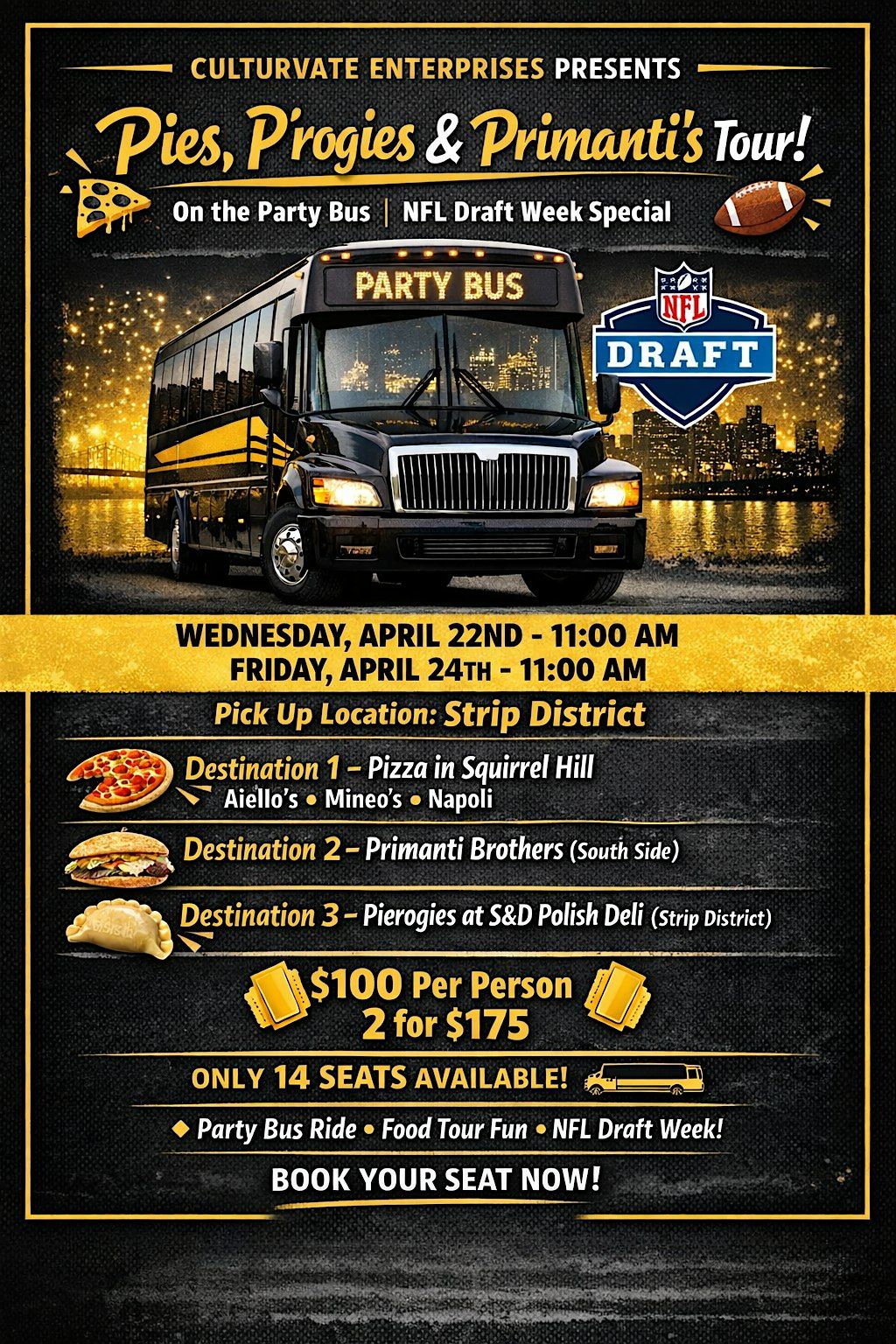 Get ready for a day of fun, trying 3 off Pittsburgh's most renowed delicacies. Join us on Wednesday, April 22nd , 2026 at 11:00 AM or Friday, April 24th at 11am to dive into some seriously tasty pies, p'rogies, and the legendary Primanti's sandwiches. It's the perfect chance to hang out, eat great food, and explore one of Pittsburgh’s coolest spots. Bring your appetite and your friends—this trifecta tour is gonna be a blast!