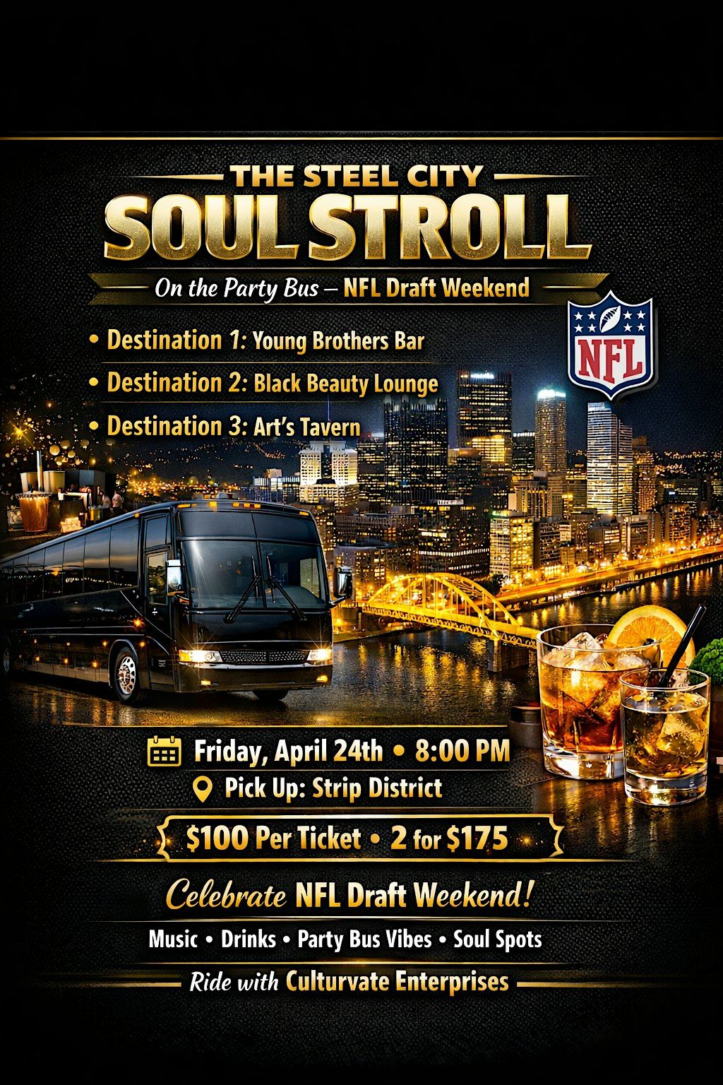 Get ready for a fun night out at some of Pittsburgh's most iconic Black Owned Bars. Join us for a bus bar crawl where you can explore great spots, enjoy good vibes, and meet awesome people. Whether you’re a local or visiting for the NFL Draft this stroll is all about having a blast and soaking up the soul of the city. Don’t miss out on a night full of great drinks and good times!