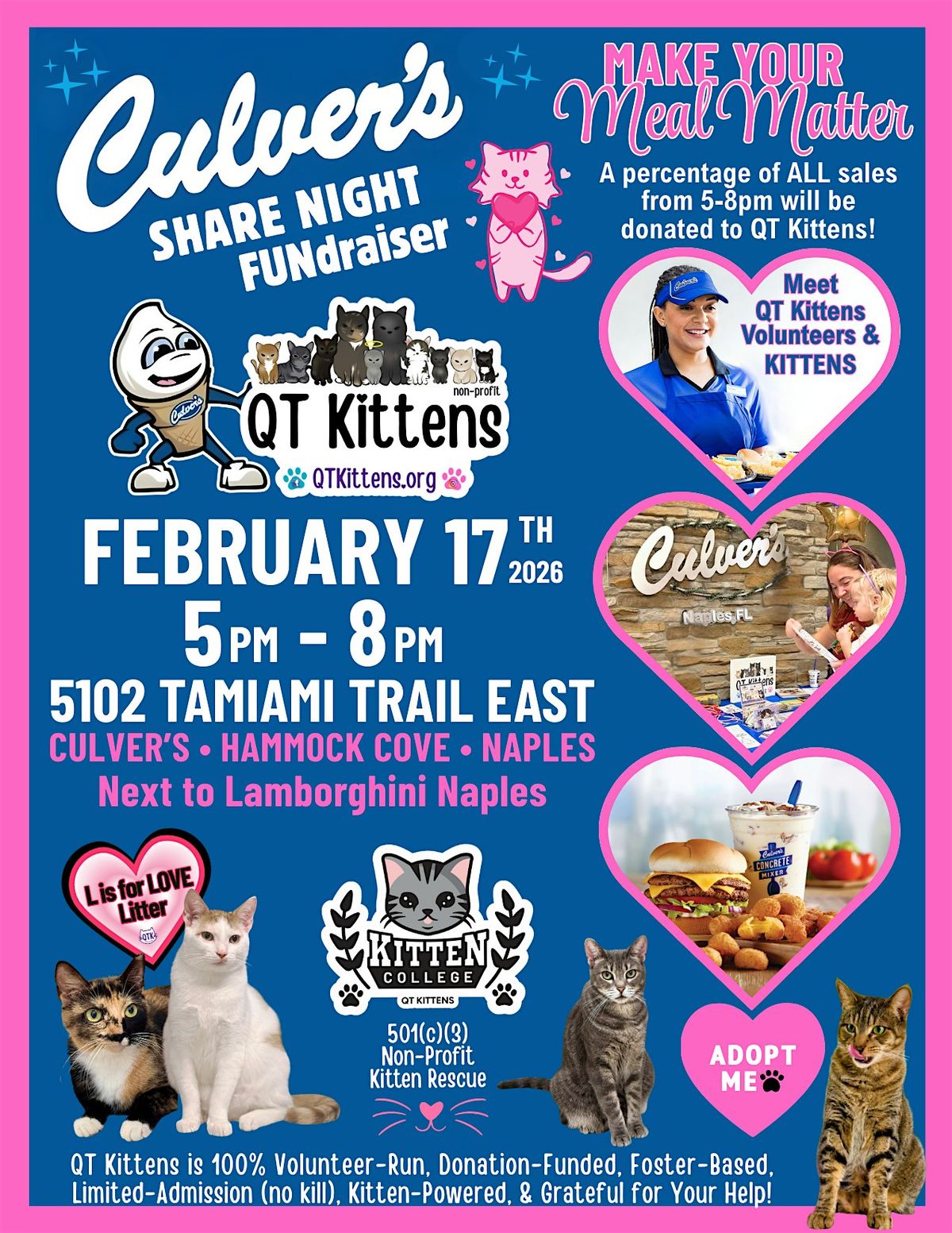 Come sink your claws into delicious Culver’s favorites while supporting our furry friends! Our PAWsome volunteers — joined by superstars, Padmé the Therapy Cat, and special-needs sensation, Venti — will serve you with WHISKER tickling smiles and endless PURRsonal charm.