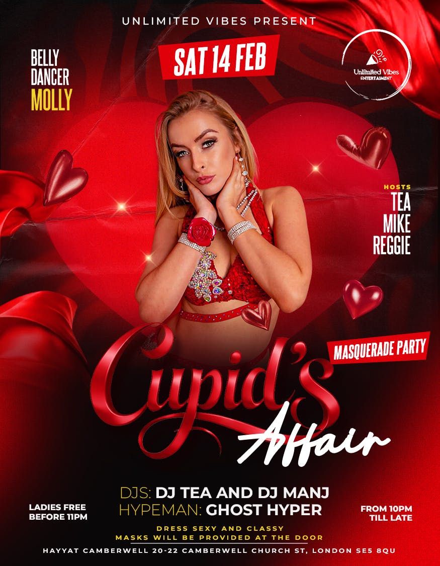 Step into a night of mystery, romance, and irresistible vibes at Cupid’s Affair, the ultimate Valentine’s masquerade experience. Get ready to indulge in an evening where elegance meets allure, surrounded by stunning décor, glowing lights, and an atmosphere made for unforgettable moments.Feel the rhythm all night long with the best of R&B, Afrobeats, and Amapiano, setting the perfect tone for dancing, flirting, and celebrating love in all its forms. A captivating belly dancerwill take the stage, bringing a touch of enchantment and sensual artistry to the night’s entertainment.