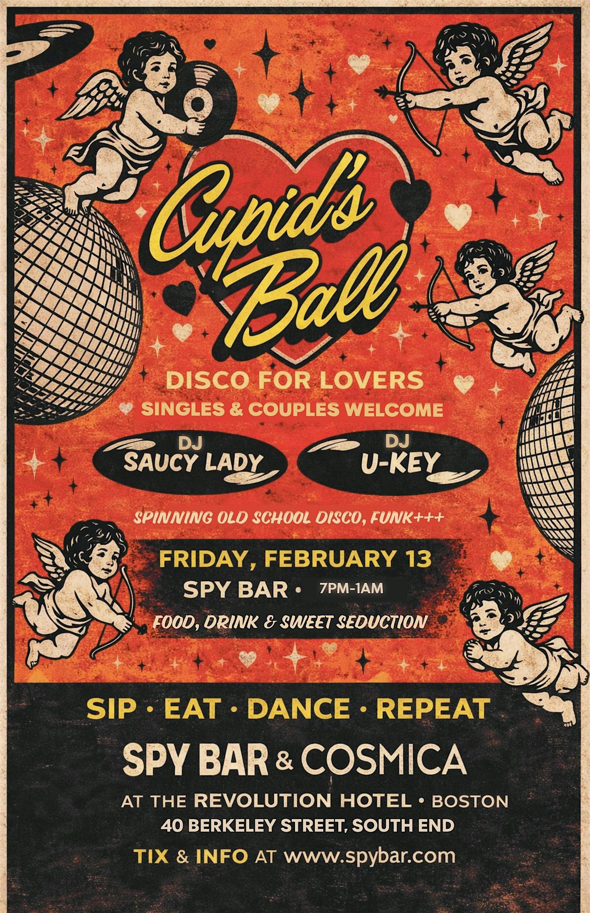 A special Valentine’s menu from Cósmica Mexican Food & Bar’s kitchen will be served at Spy Bar (limited seating). Dinner reservations are best between 7:00 PM and 9:30 PM. After that, there’s plenty of room to dance, mingle, and stay close.