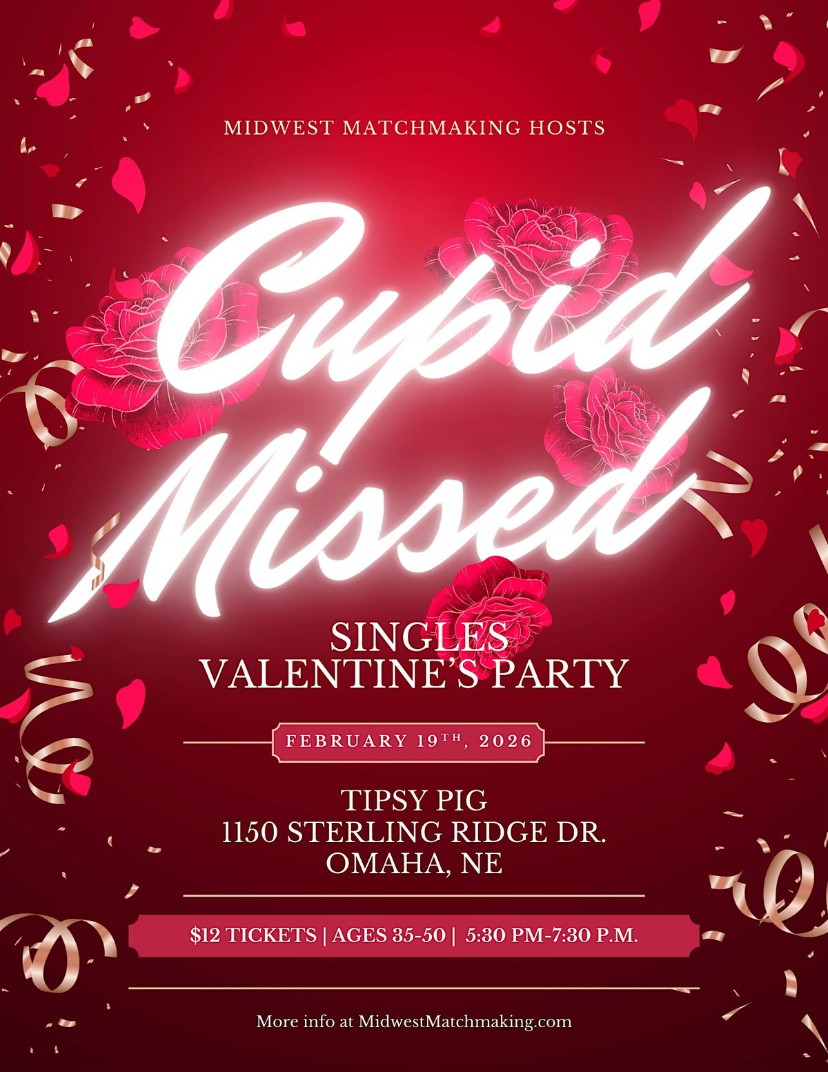 Join us for the Cupid Missed Valentine’s Party, a fun, low-pressure singles mixer for Omaha singles ages 35–50. If February 14th came and went without fireworks, consider this your official do-over.