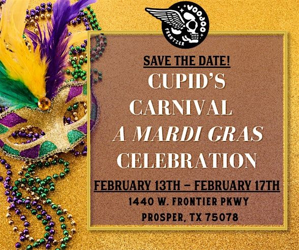 Welcome to Cupid's Carnival - Mardi Gras Celebration! 🎠Get ready to experience a night of fun and excitement at Voodoo Brewing Co. - Frontier! Let the good times roll as we celebrate in style!