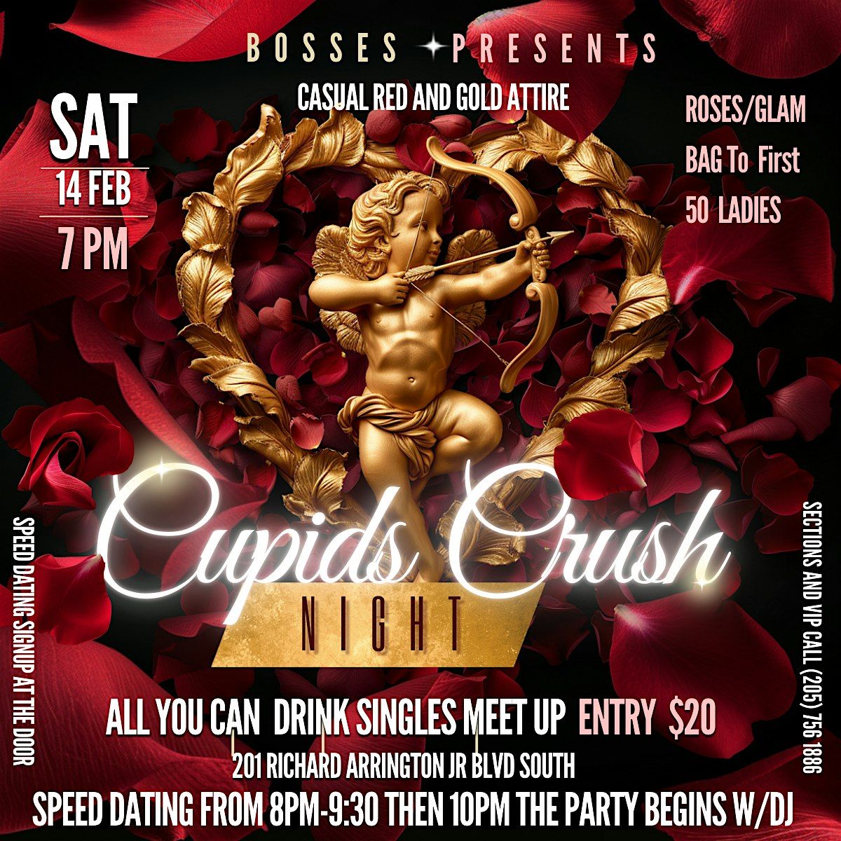 Looking for love or just a fun night out? Join us in person for an exciting evening of games, quick chats, and instant connections. It's all about meeting new people, sharing laughs, and maybe finding that special someone. No stress, no pressure—just good vibes and great company. Don’t miss out on this chance to mix, mingle, and crush it at Cupid’s favorite event! Red and Gold attire.