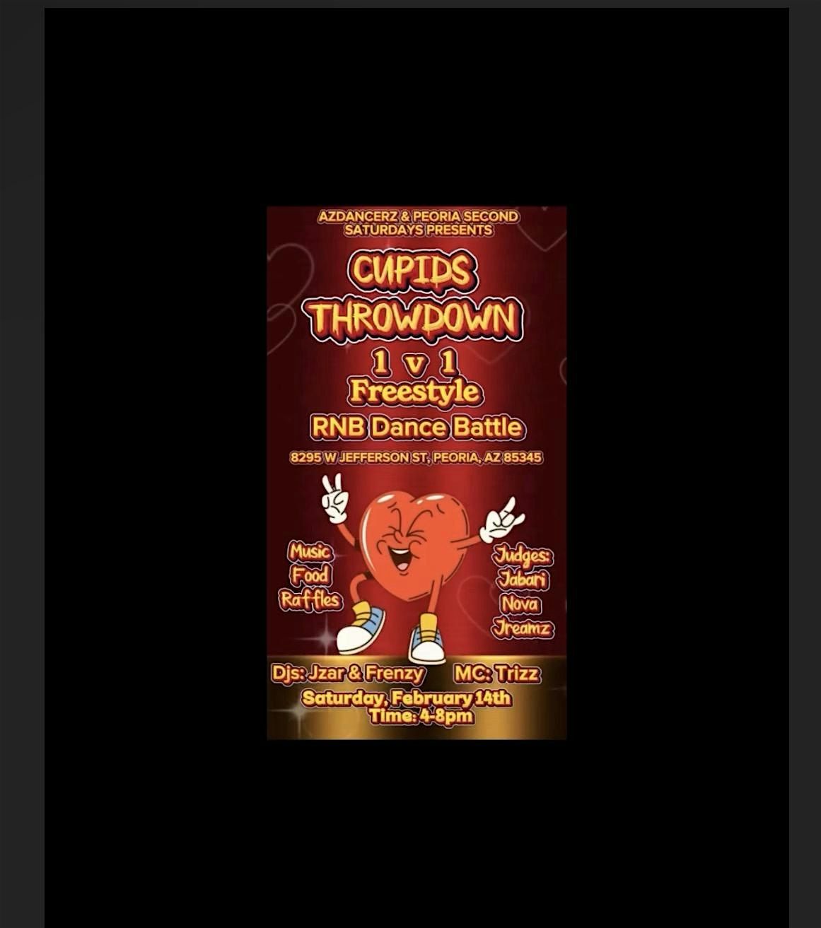 Cupid’s Throwdown marks the first dance-oriented event to be featured as part of Peoria’s Second Saturdays. Second Saturdays began as a monthly downtown arts and culture experience created to bring the community together through local businesses, music, art, and creative gatherings. This Valentine’s Day edition introduces freestyle dance into the mix with a chill, R&B-focused 1v1 battle and open jam. The atmosphere is relaxed and welcoming — less about intense competition and more about movement, connection, and celebrating creativity alongside Peoria’s growing arts scene.
