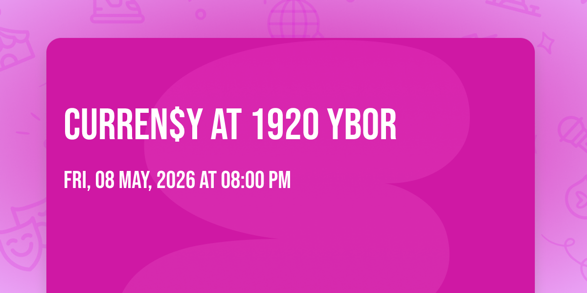 🎉 Welcome to Curren$y at 1920 Ybor, where dreams come alive and possibilities are endless! 🏛️ Join us at 1920 Ybor in the heart of Tampa, FL for an event that defies expectations. 📅 On May 8th, 2026 at 08:00 PM, be part of something truly extraordinary as we bring together innovation, entertainment, and pure magic. ✨ Every aspect has been carefully designed to ensure an unforgettable experience for all our guests. Whether you're seeking adventure, inspiration, or simply a break from the ordinary, this event promises to deliver beyond your wildest dreams. 🎊 Prepare for a journey into the extraordinary!
