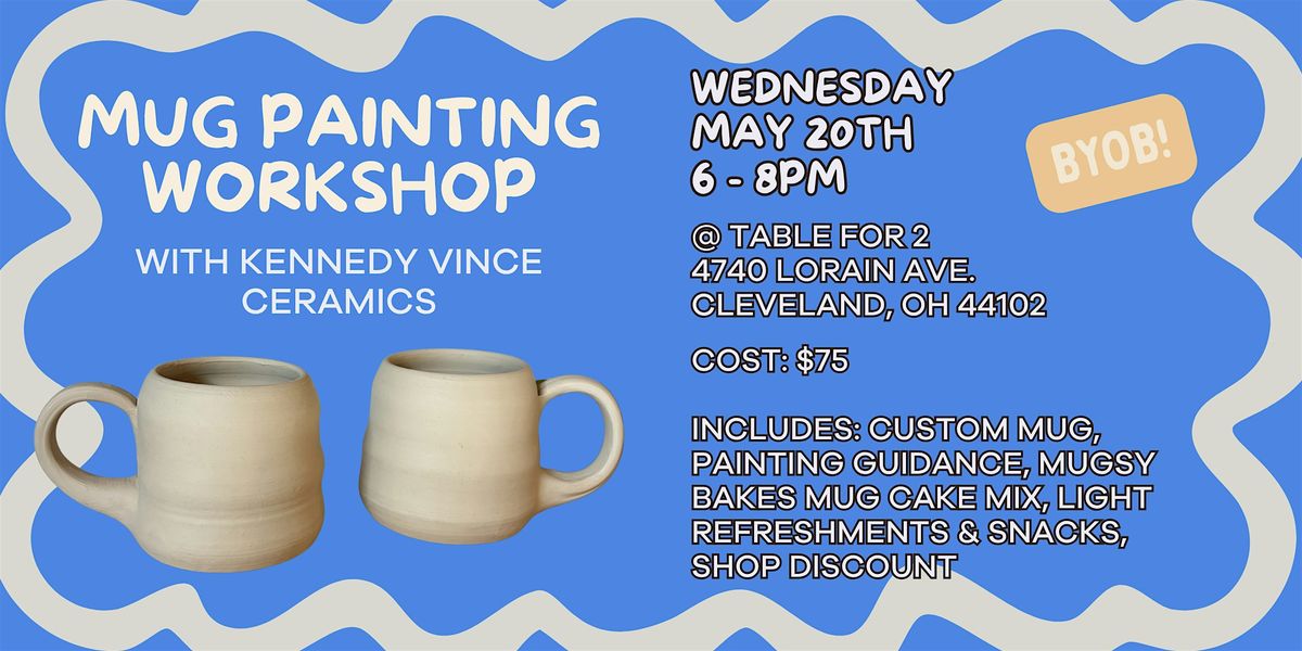 Join us for a fun, creative evening painting your own mug, hosted by Table for 2 in collaboration with Kennedy Vince Ceramics and Mugsy Bakes. Each mug is handcrafted by Kennedy Vince Ceramics and thoughtfully designed for Mugsy Bakes mug cakes.