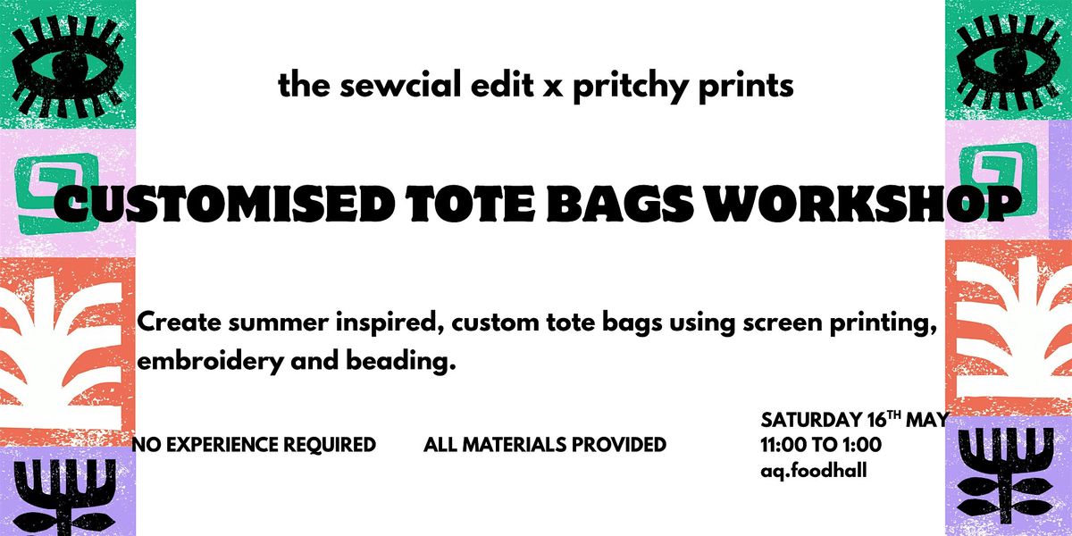 Join Issy and Kirsty at our latest workshop, customising tote bags using screen printing, embroidery and beading.